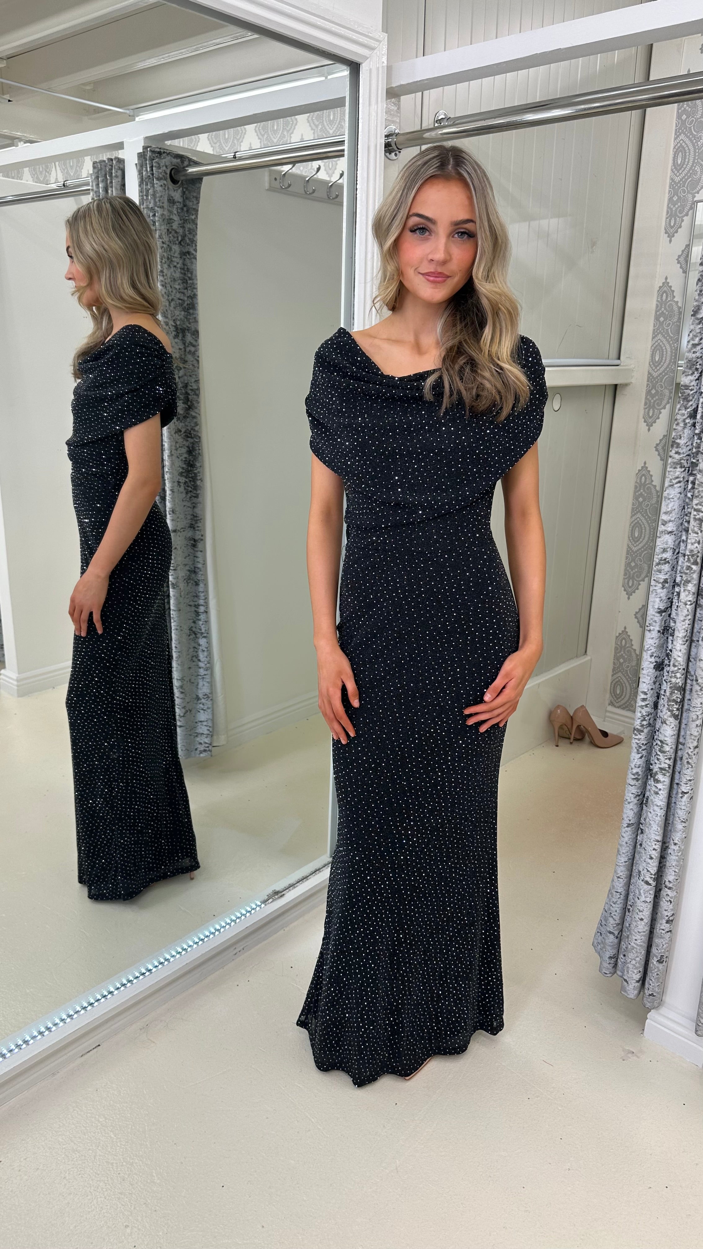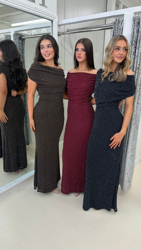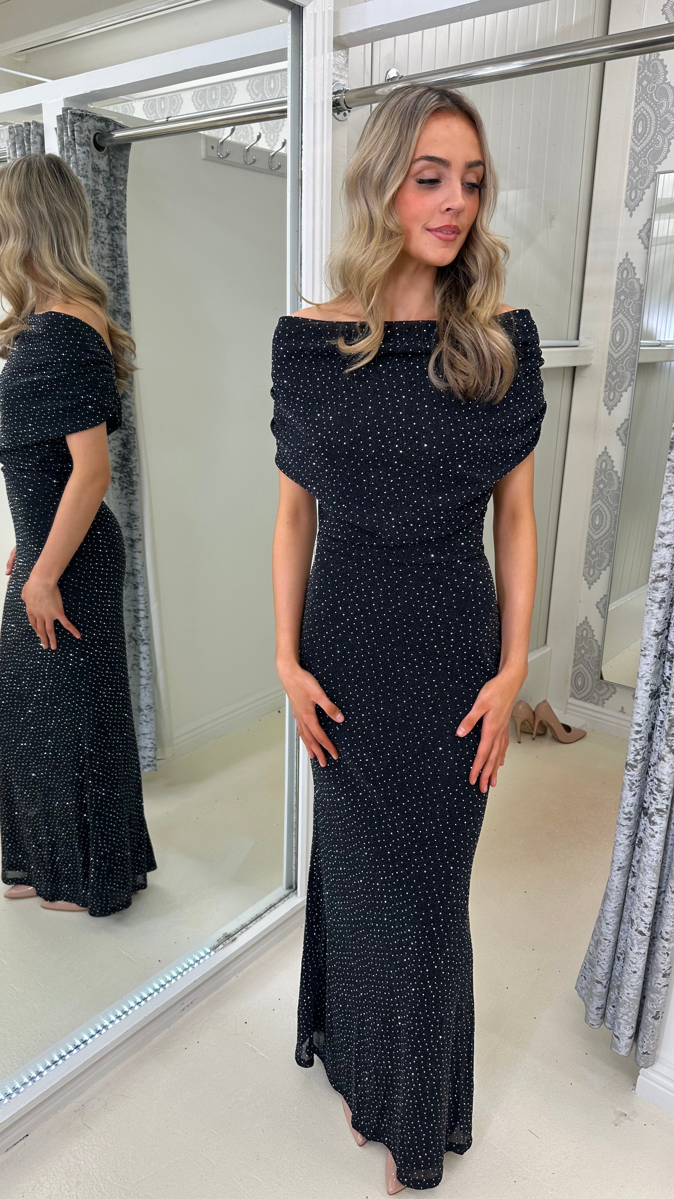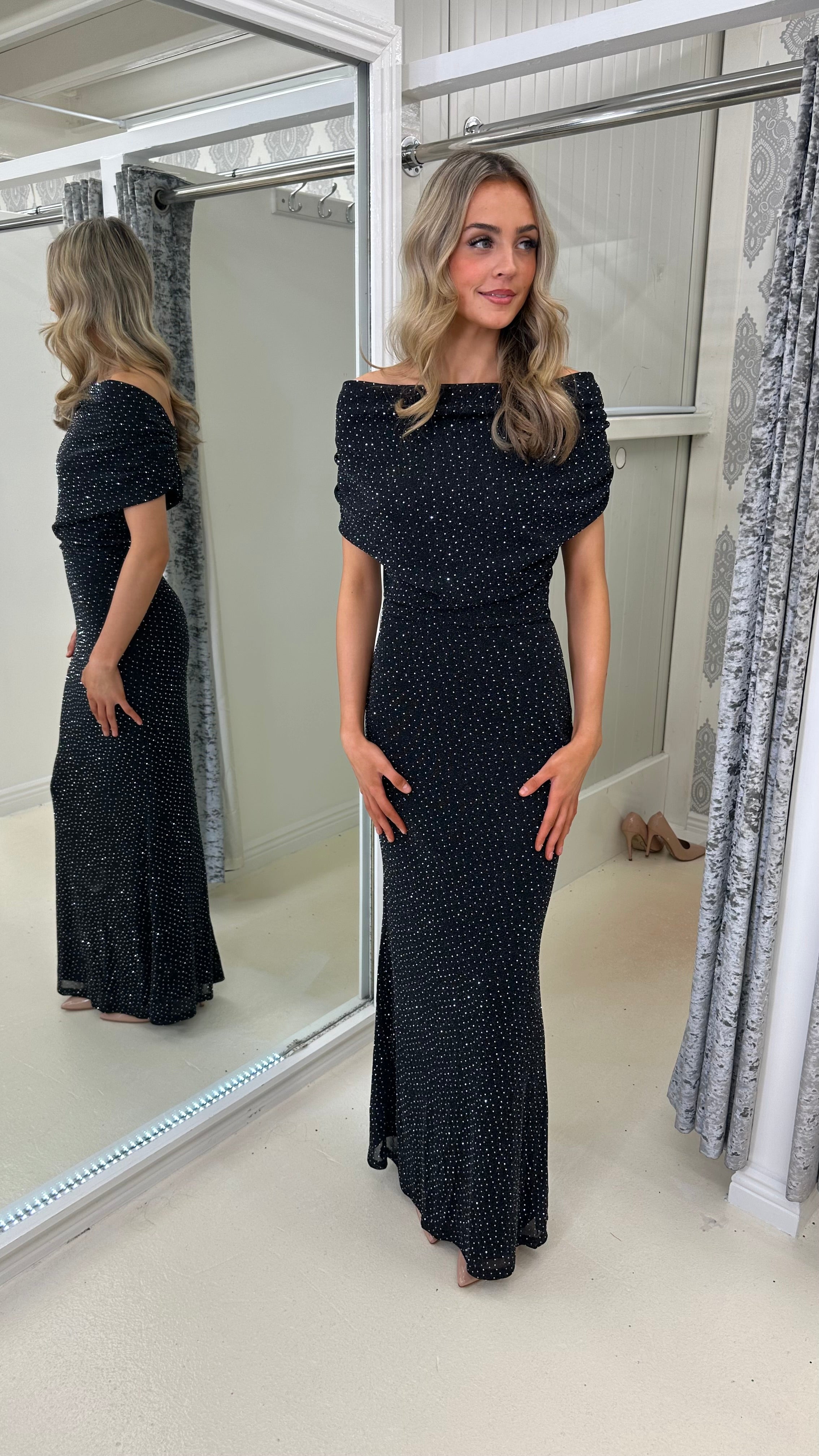 Beautiful slinky stretchy material dress with diamonte studs all over. Can be worn on or off the shoulder