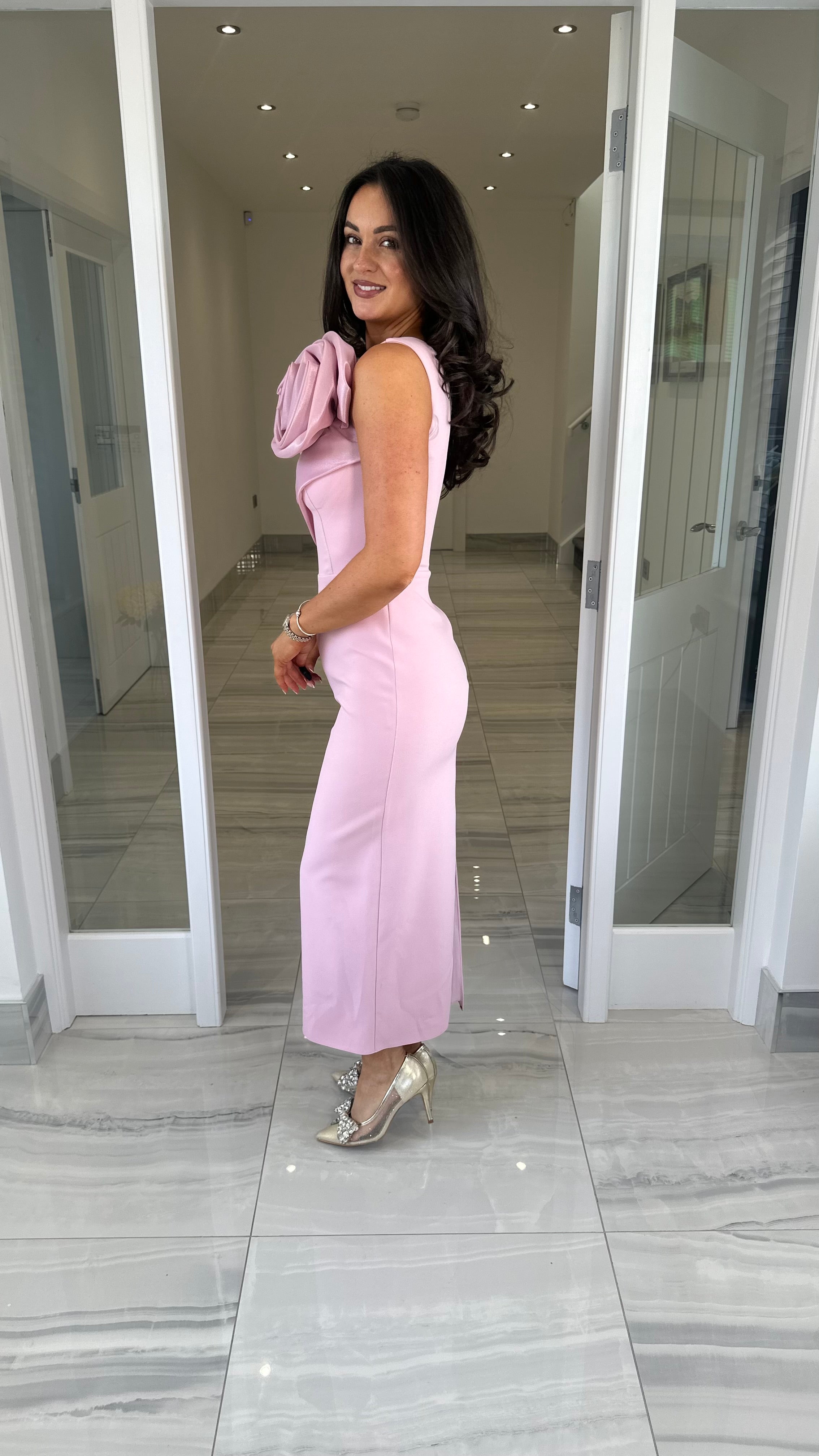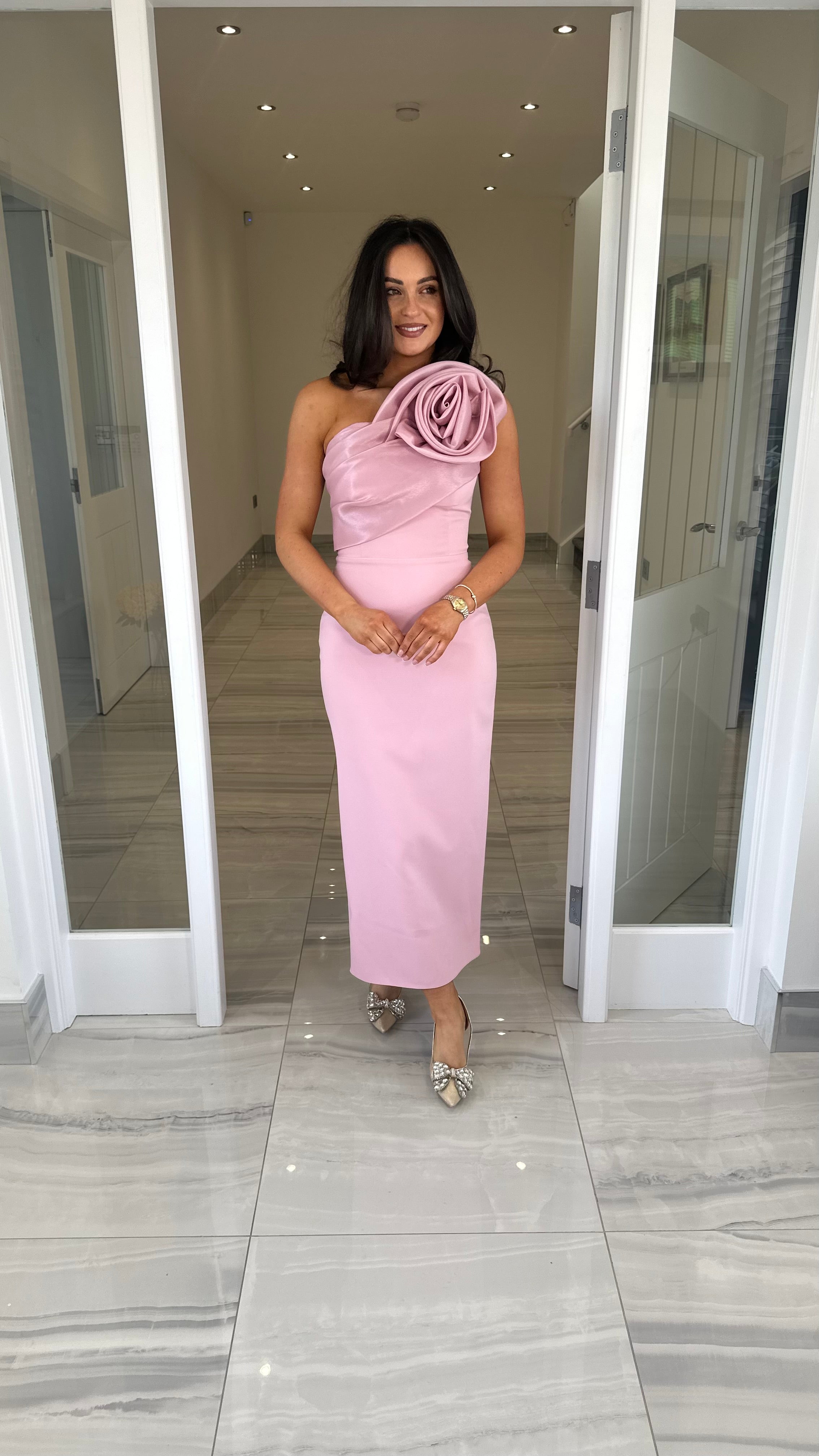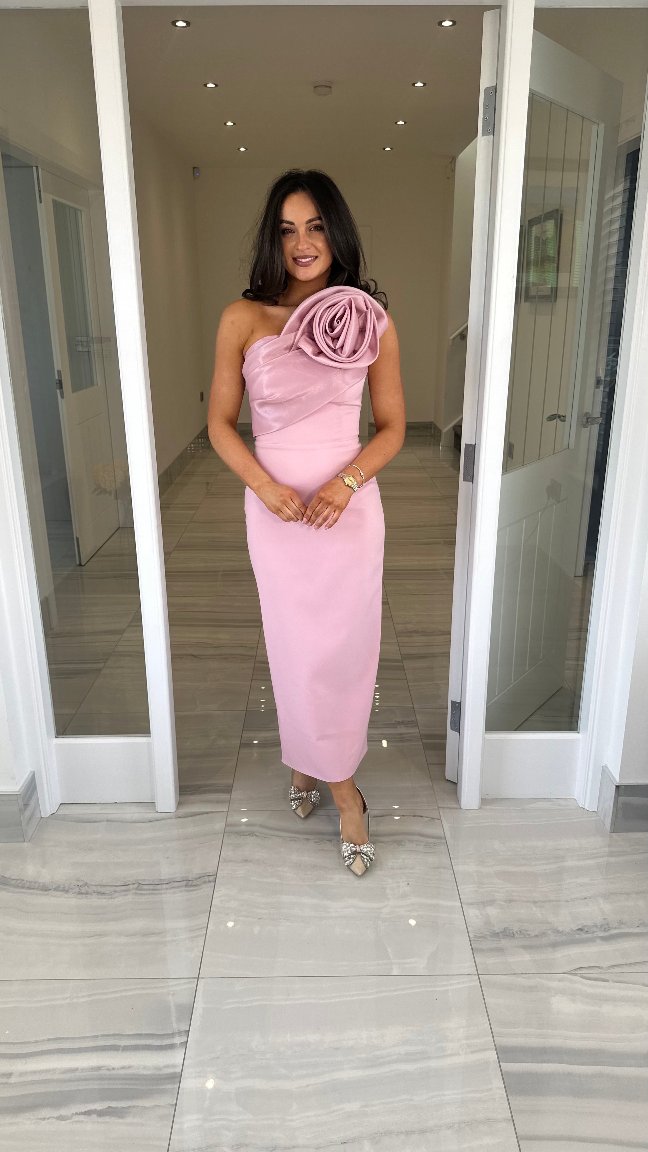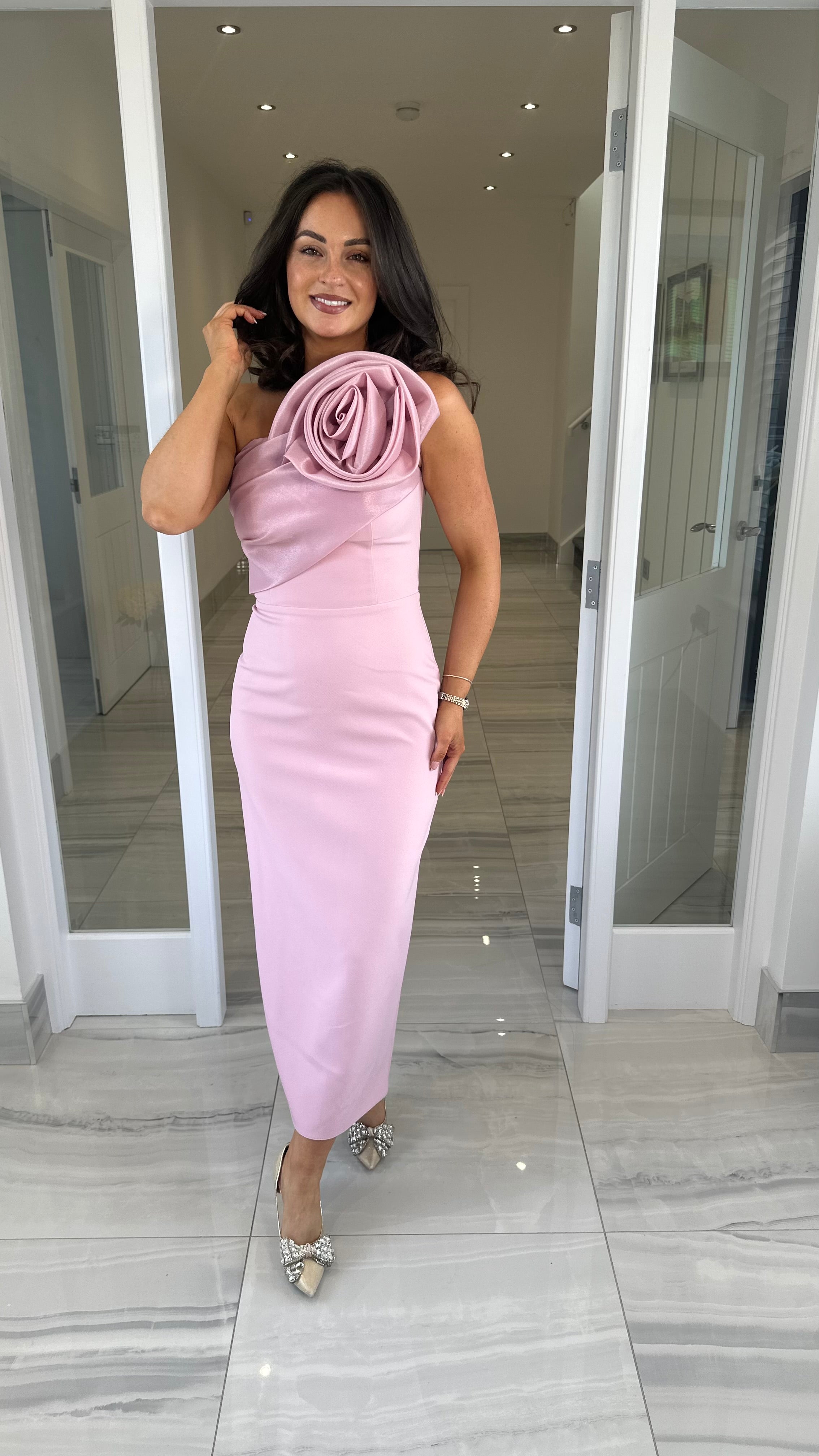 Beautiful one shoulder midi length dress featuring rose detail