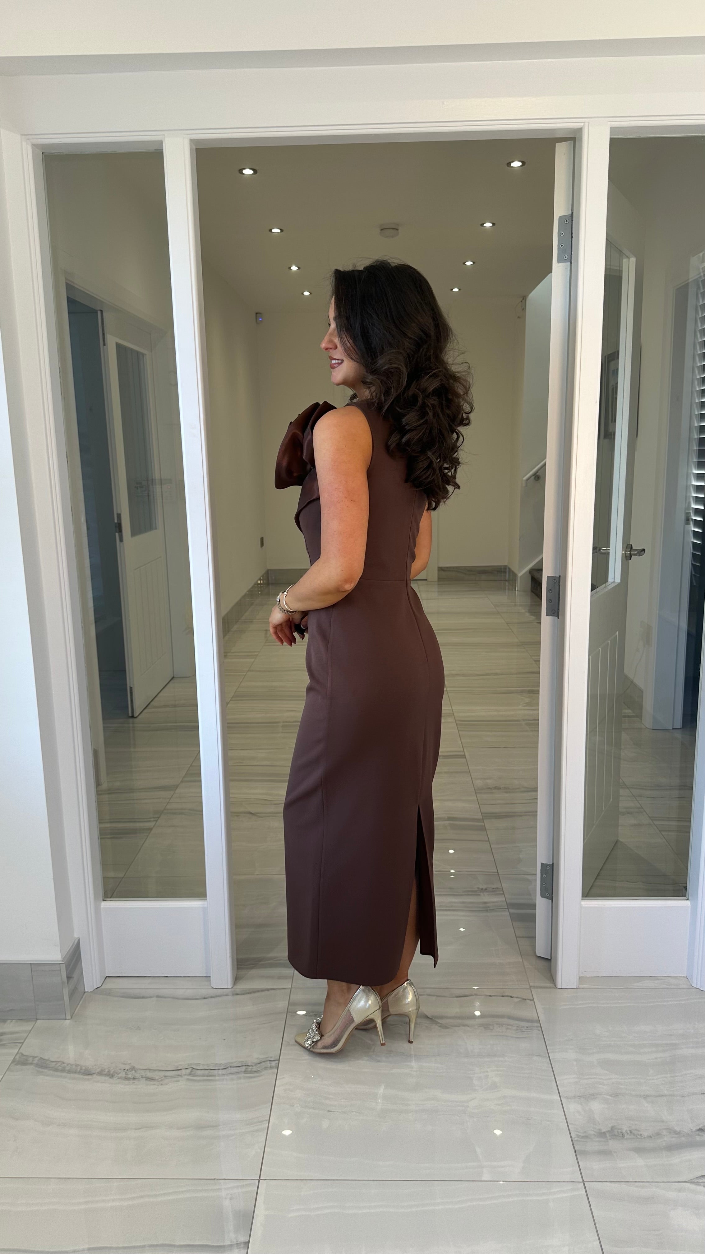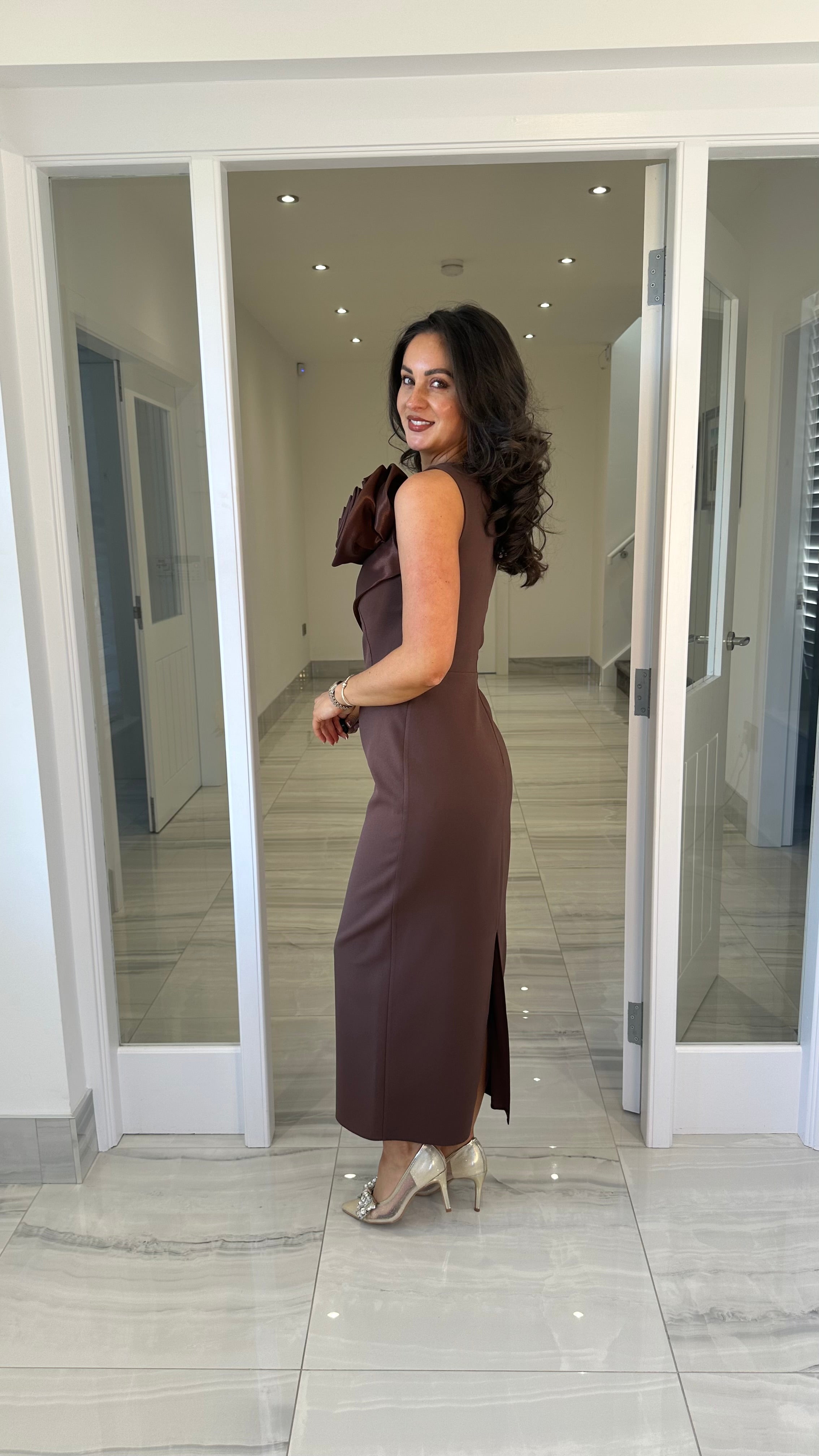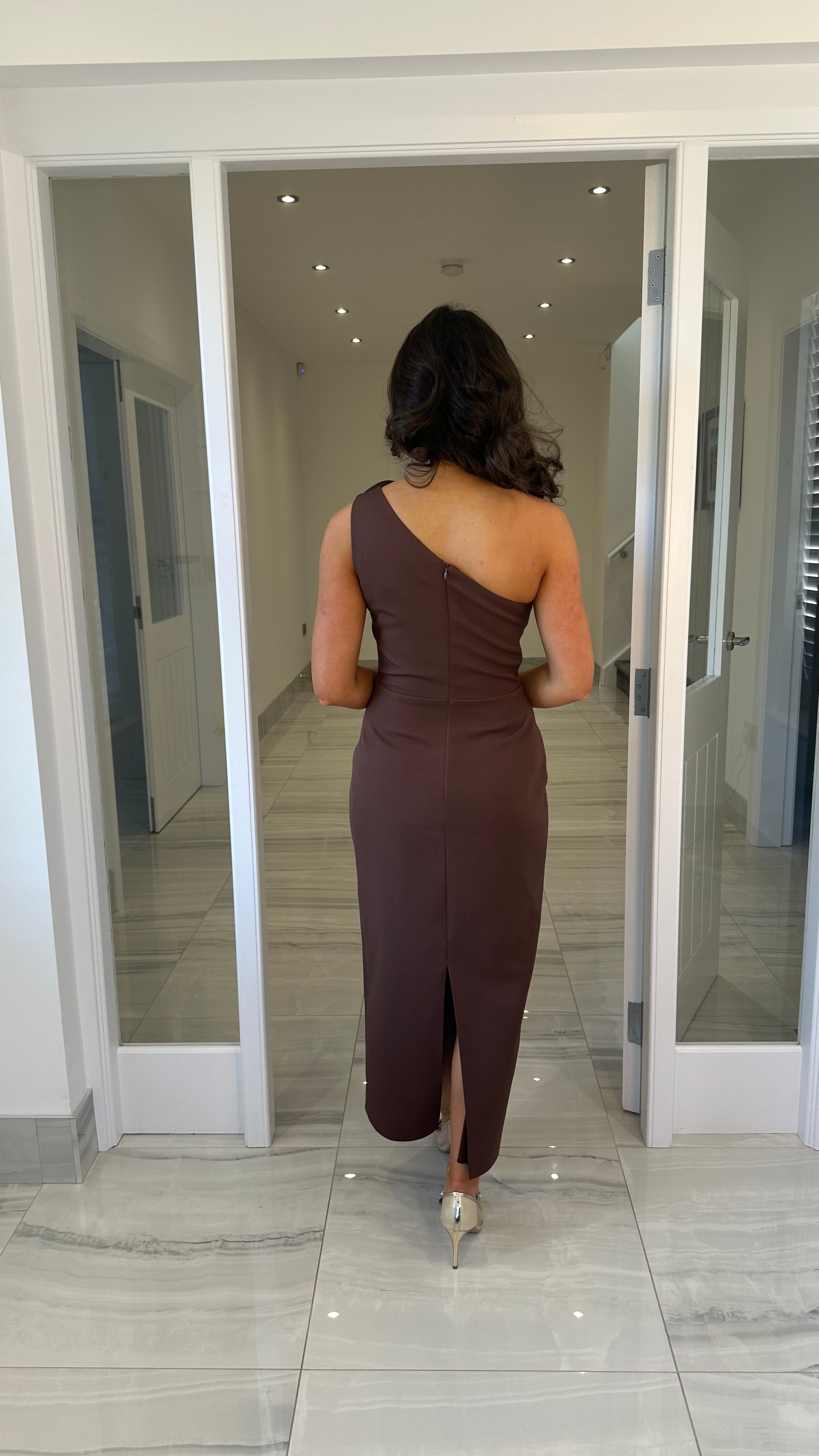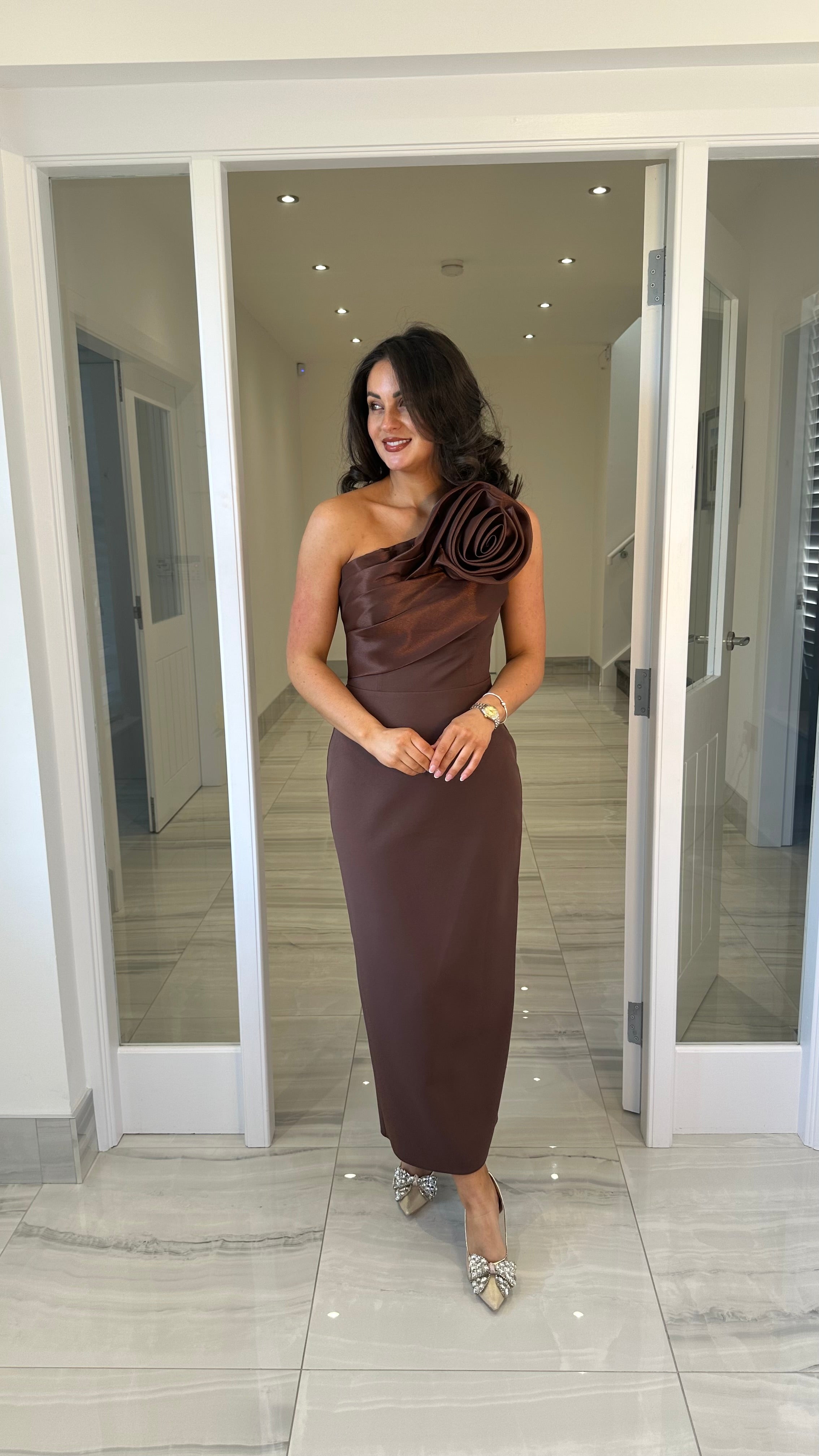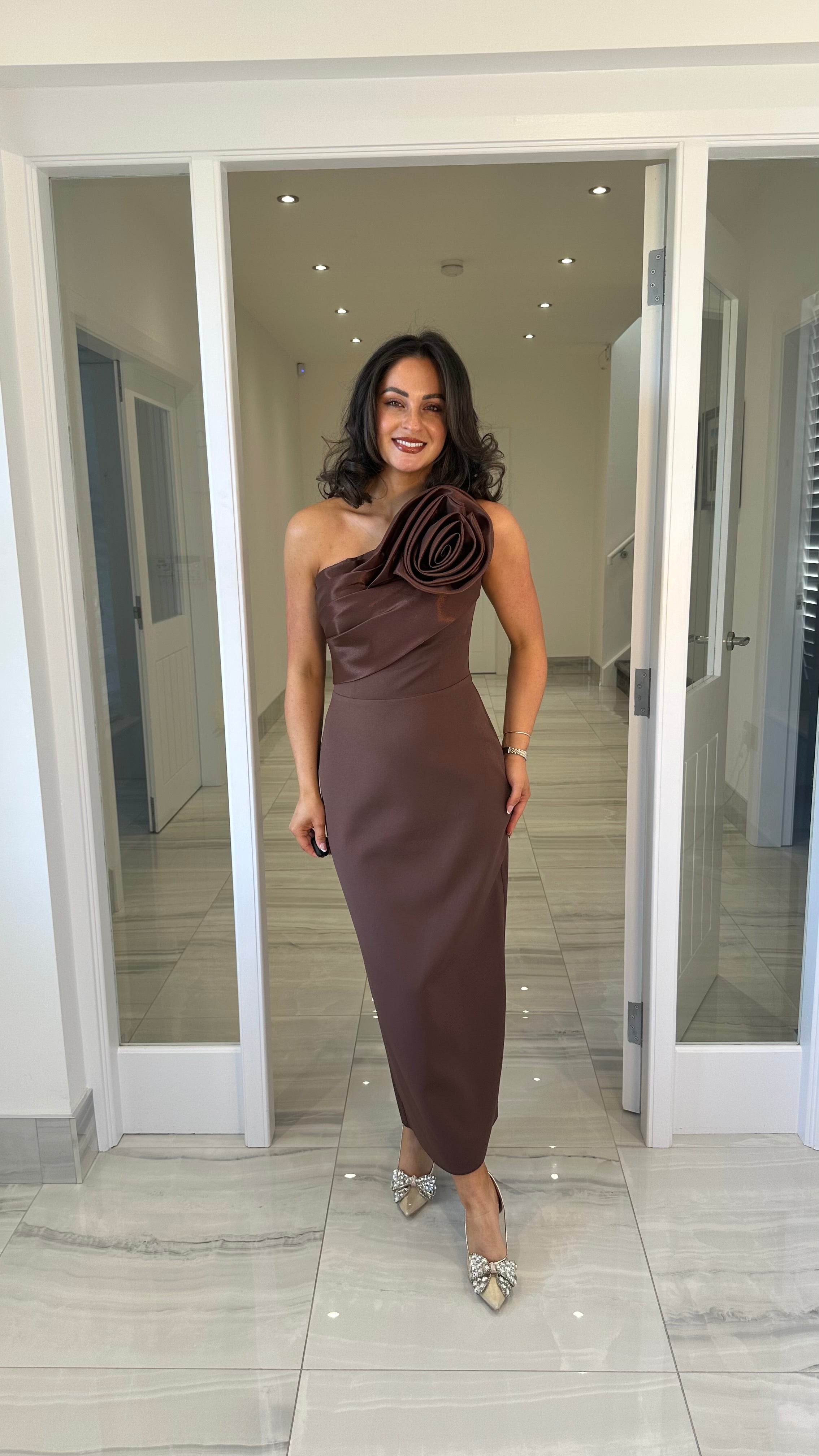 Premium Collection Brown Rose One Shoulder Midi Dress