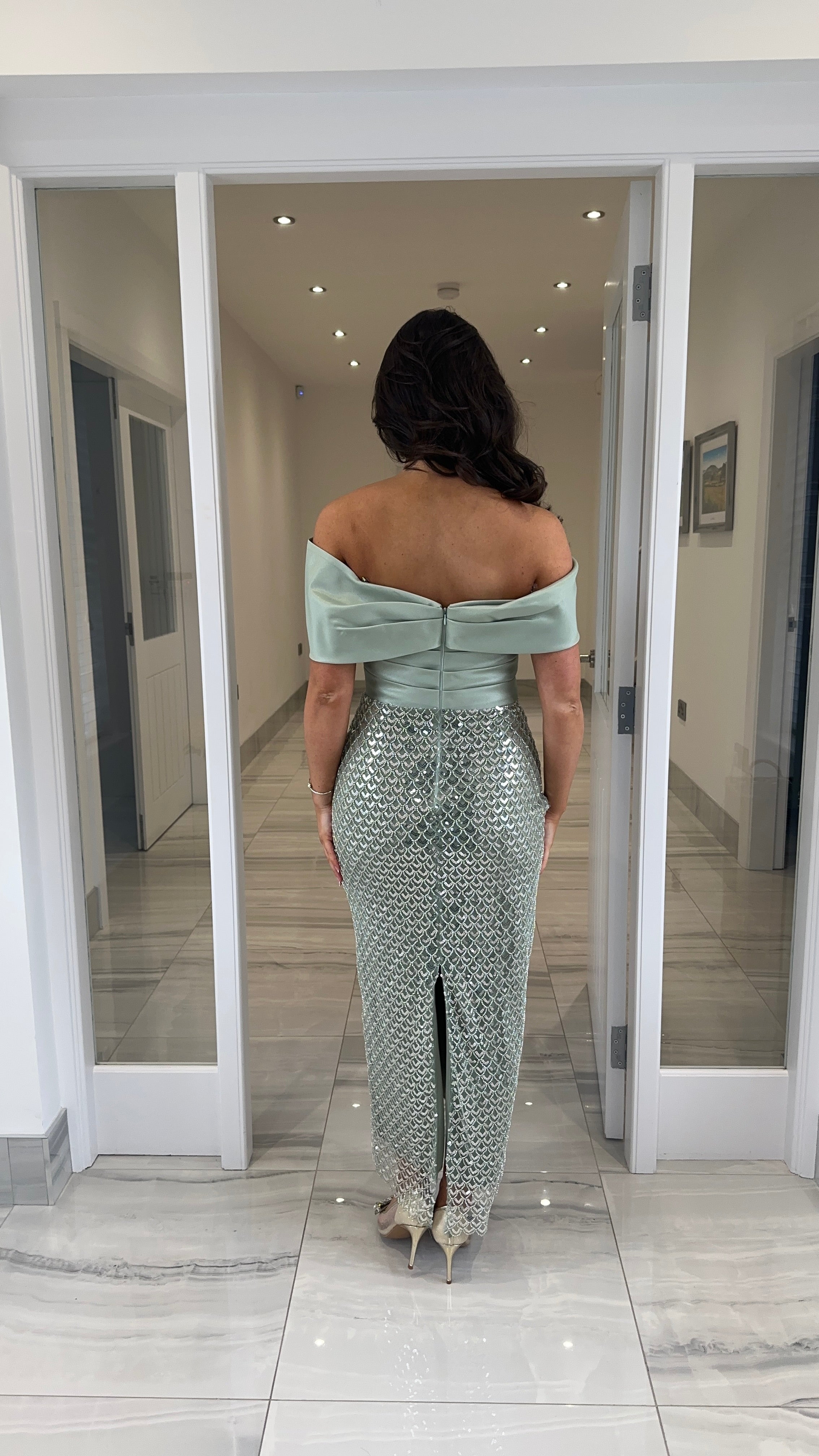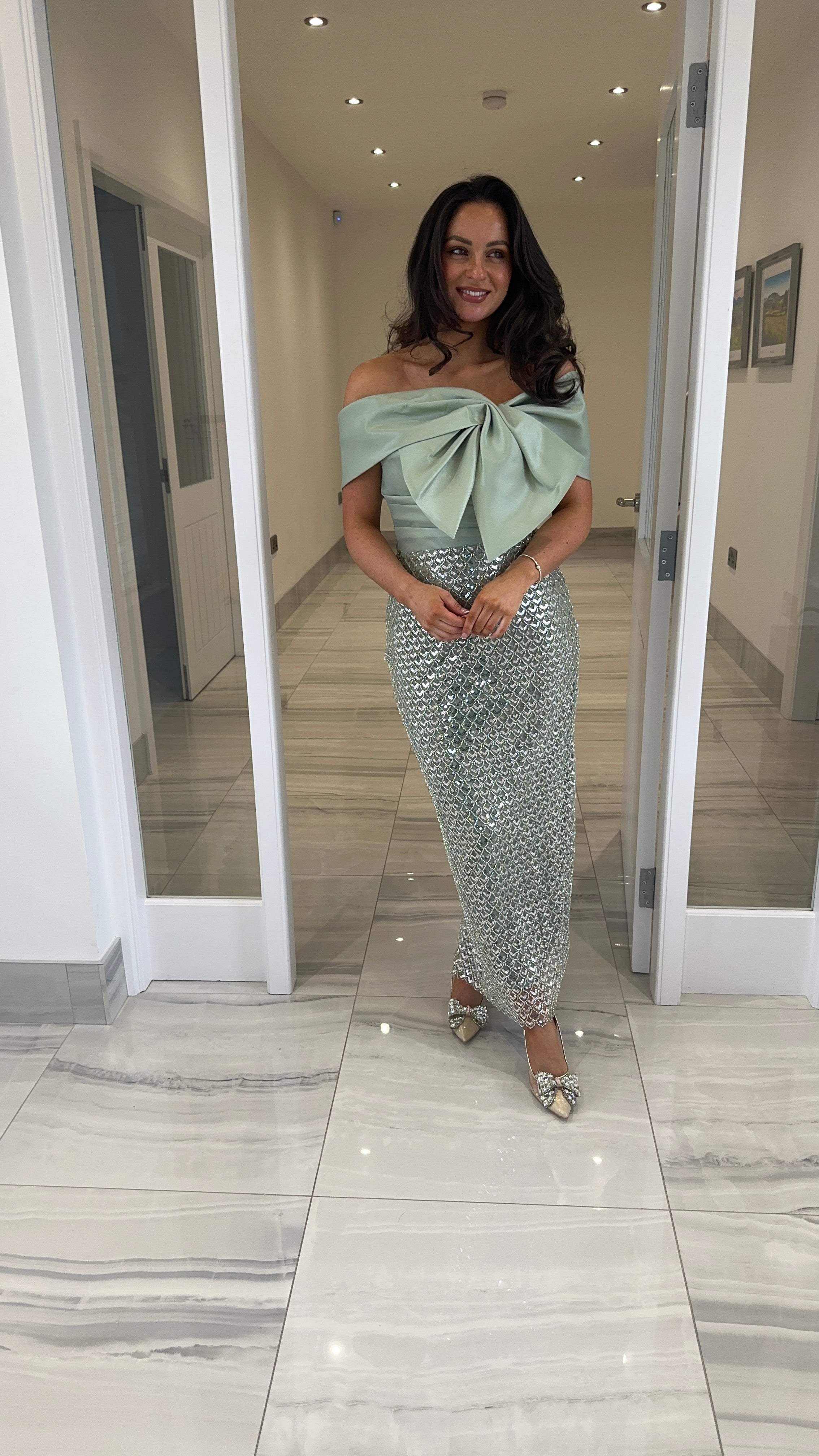 Premium Sequin Bottom Sage Bow Front Midi Dress