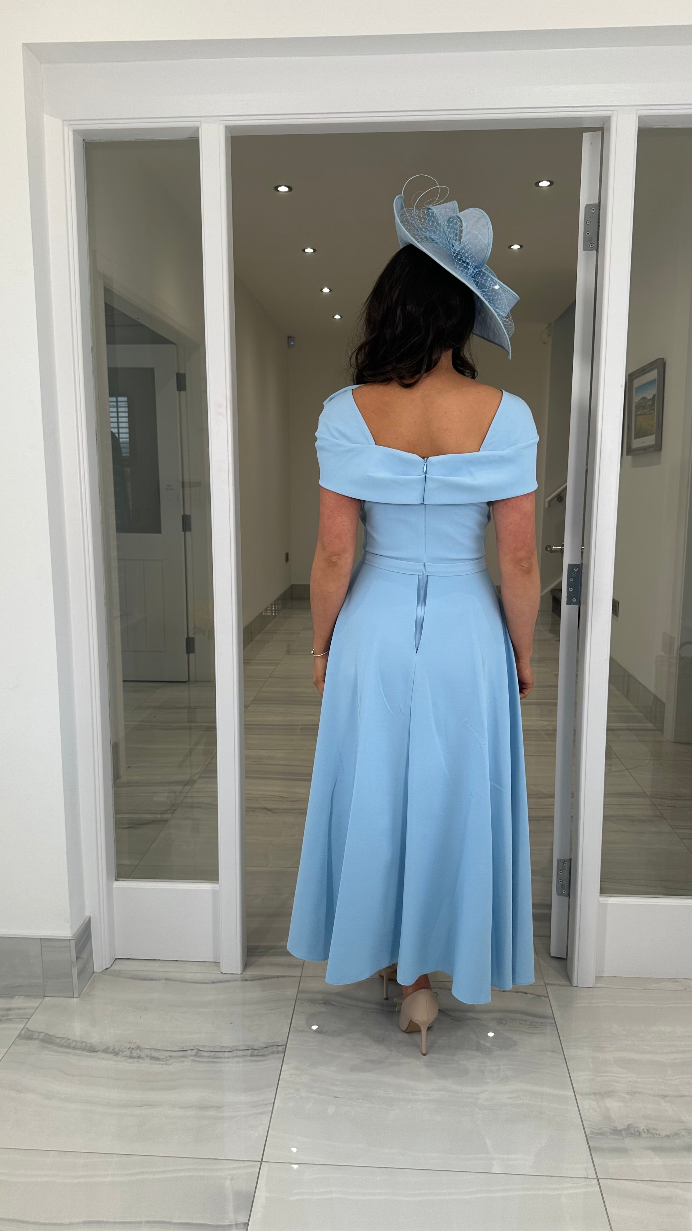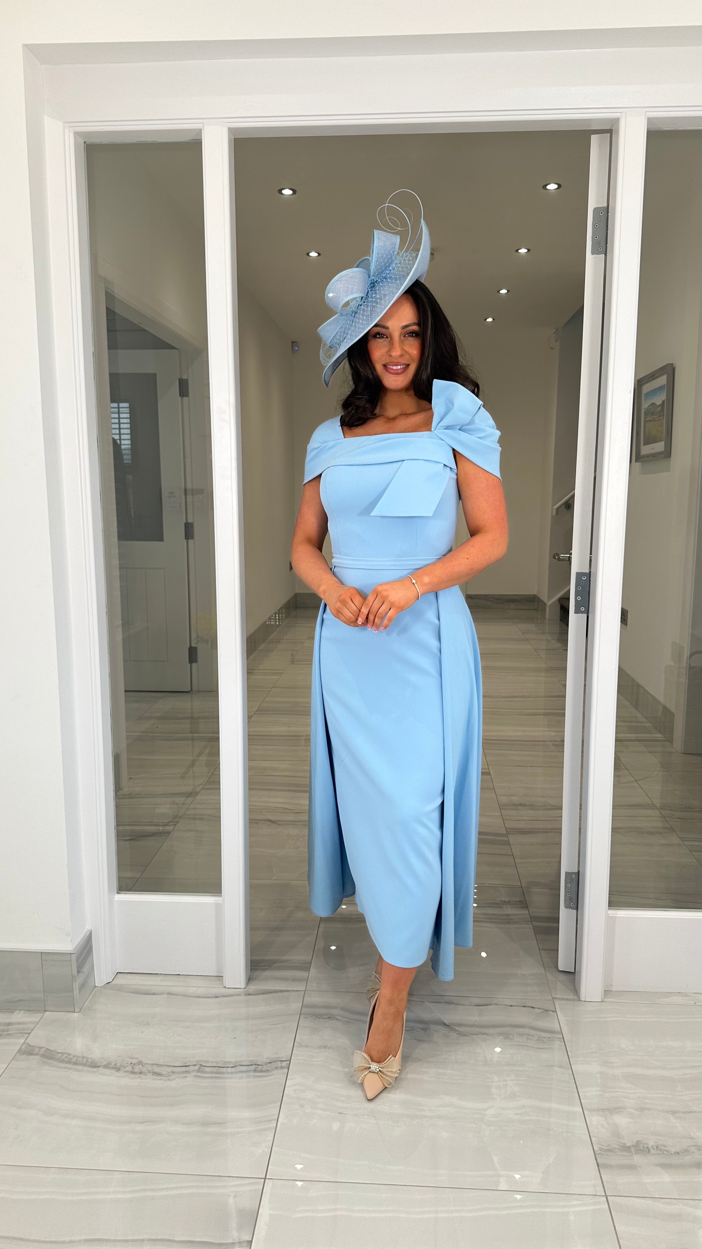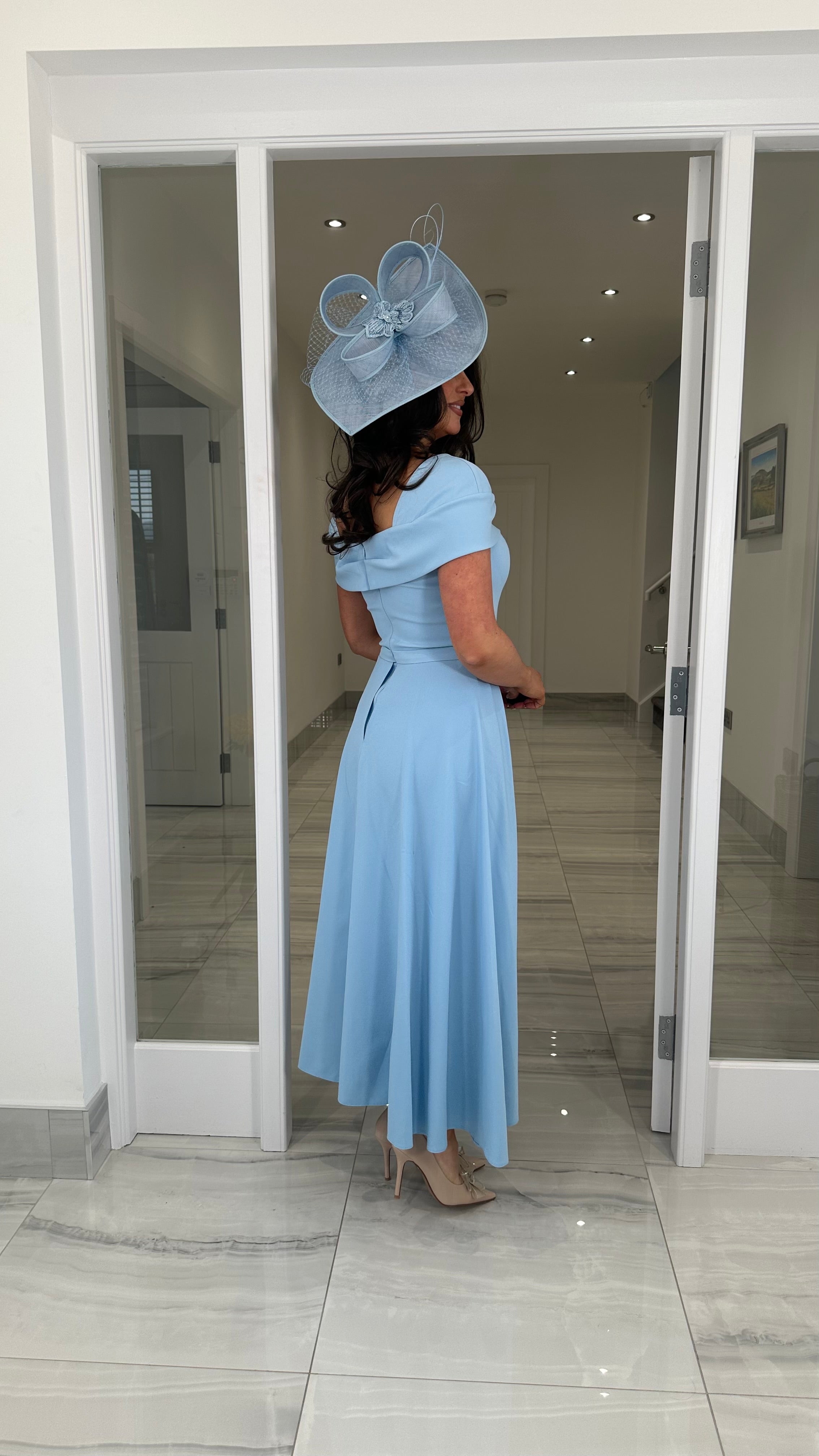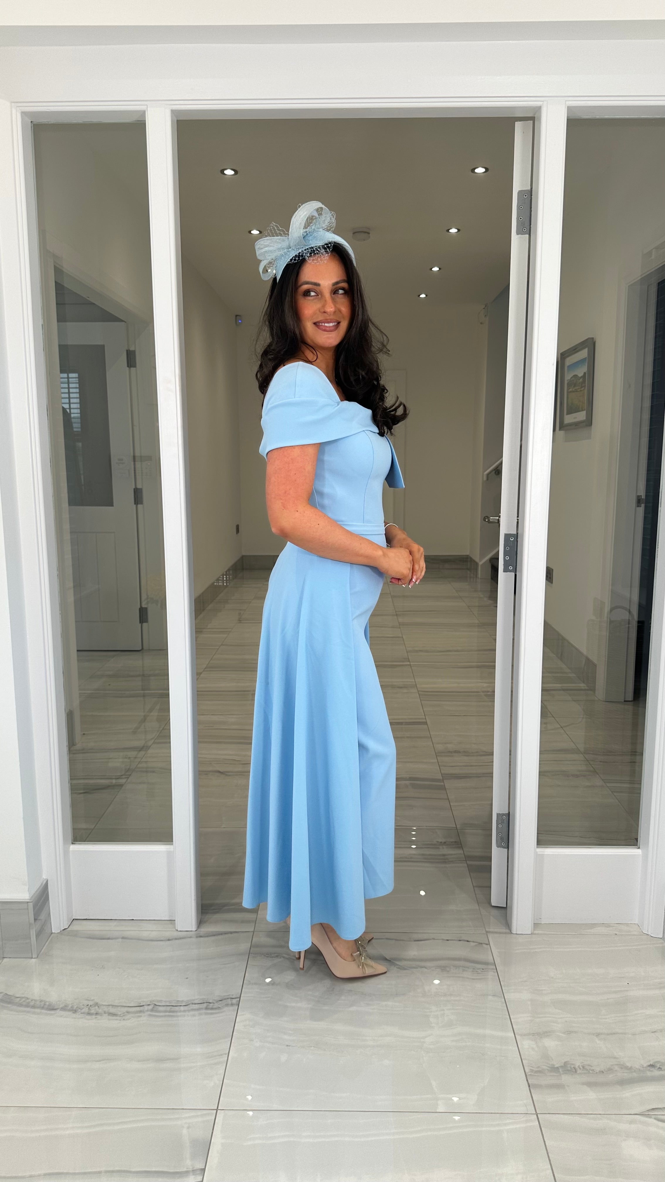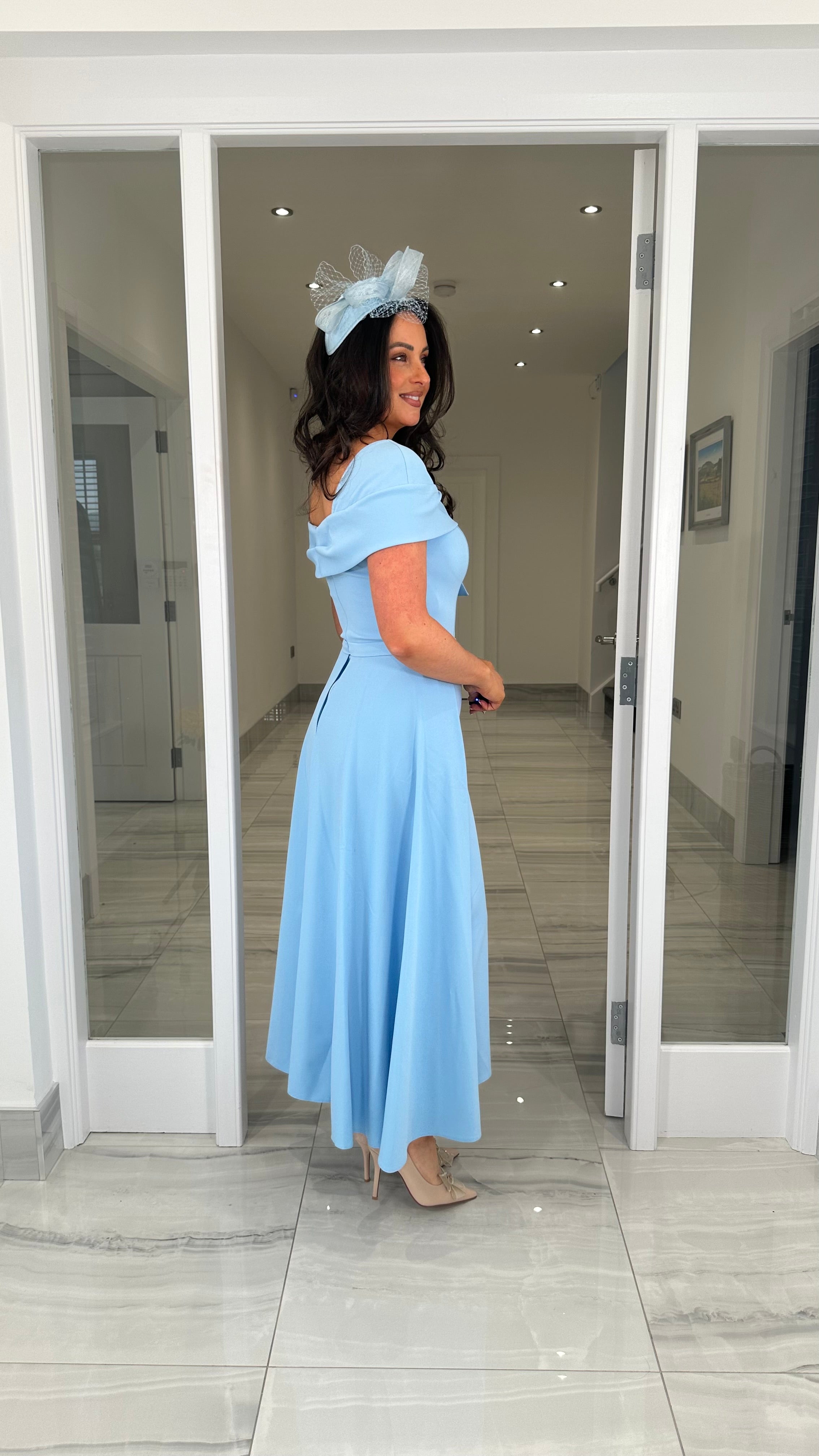 Beautiful blue coloured Bardot neckline dress featuring a bow detail, fitted skirt and extra skater skirt design