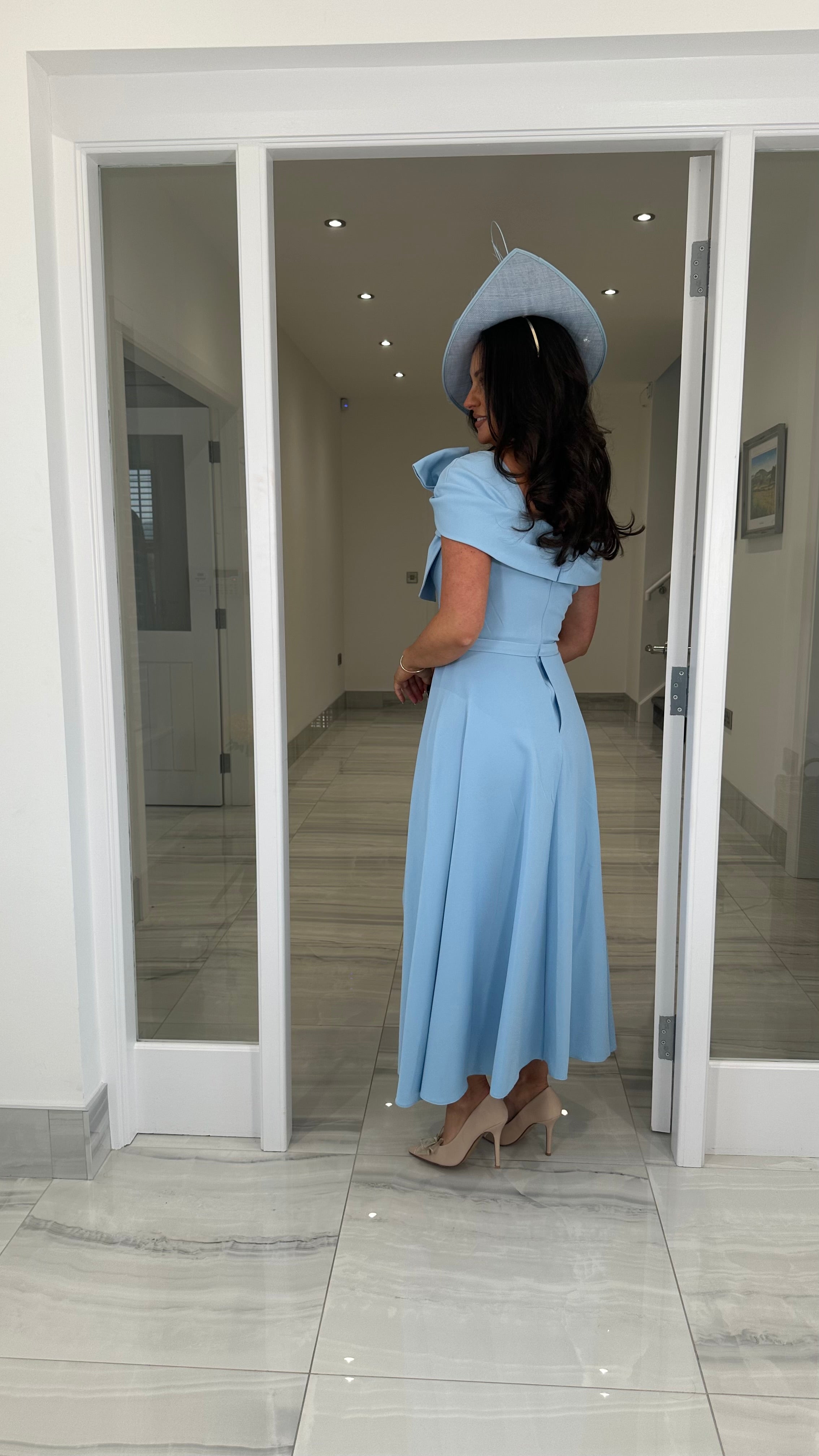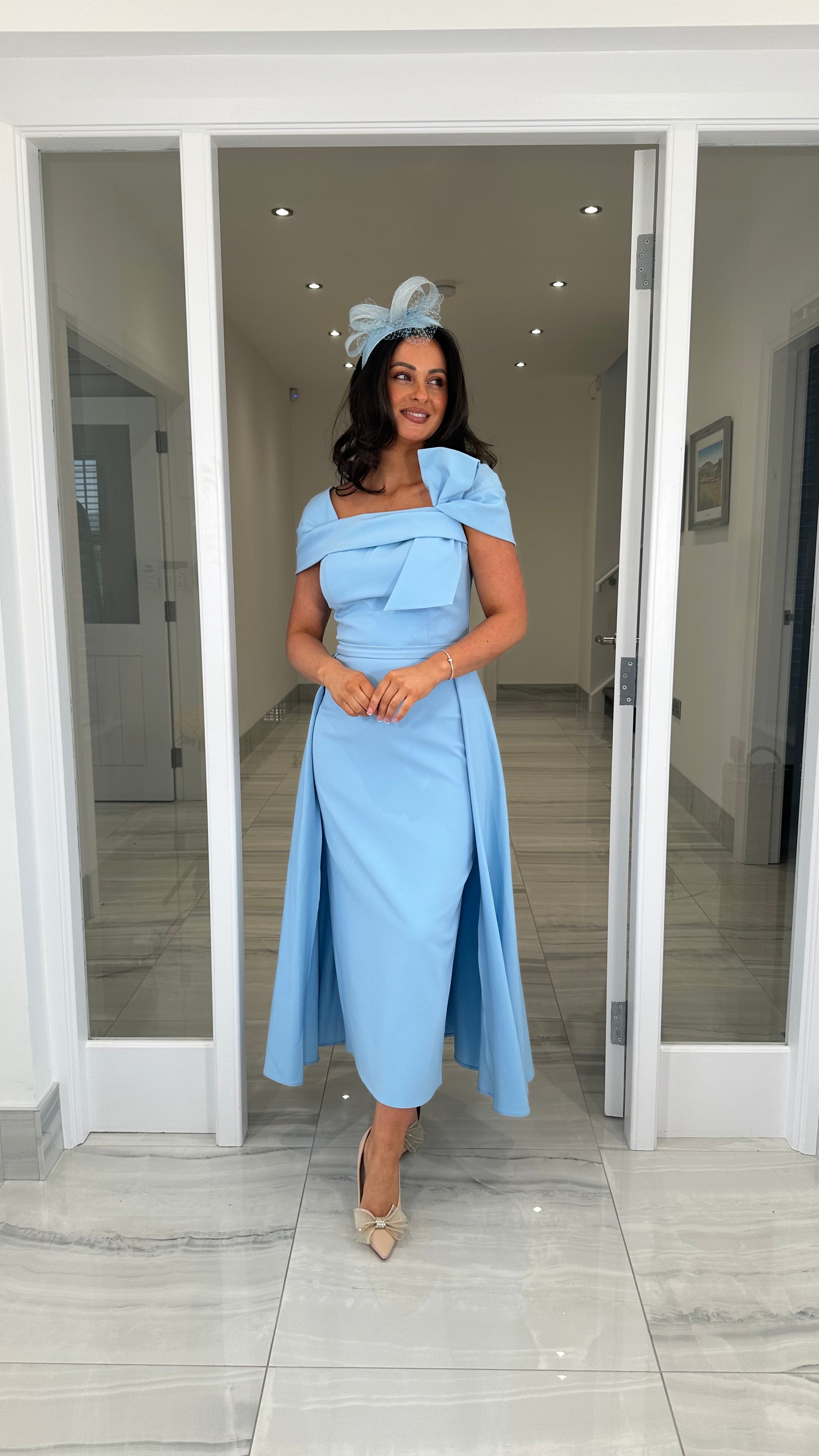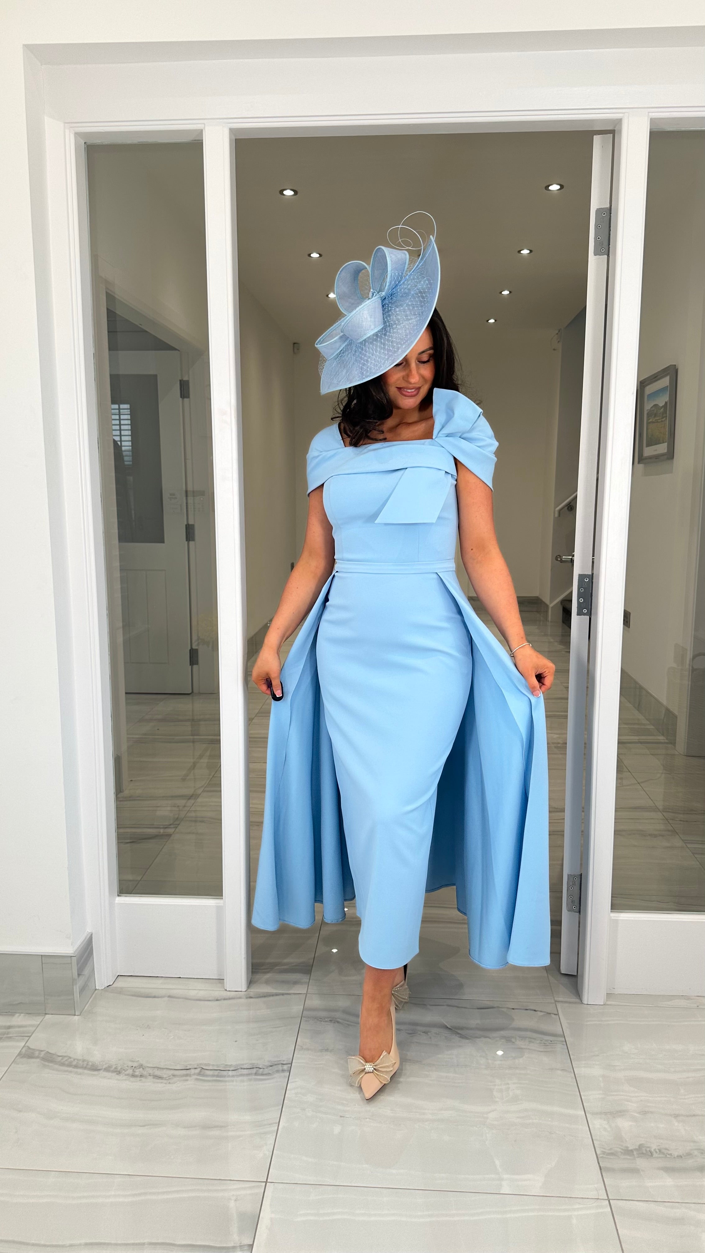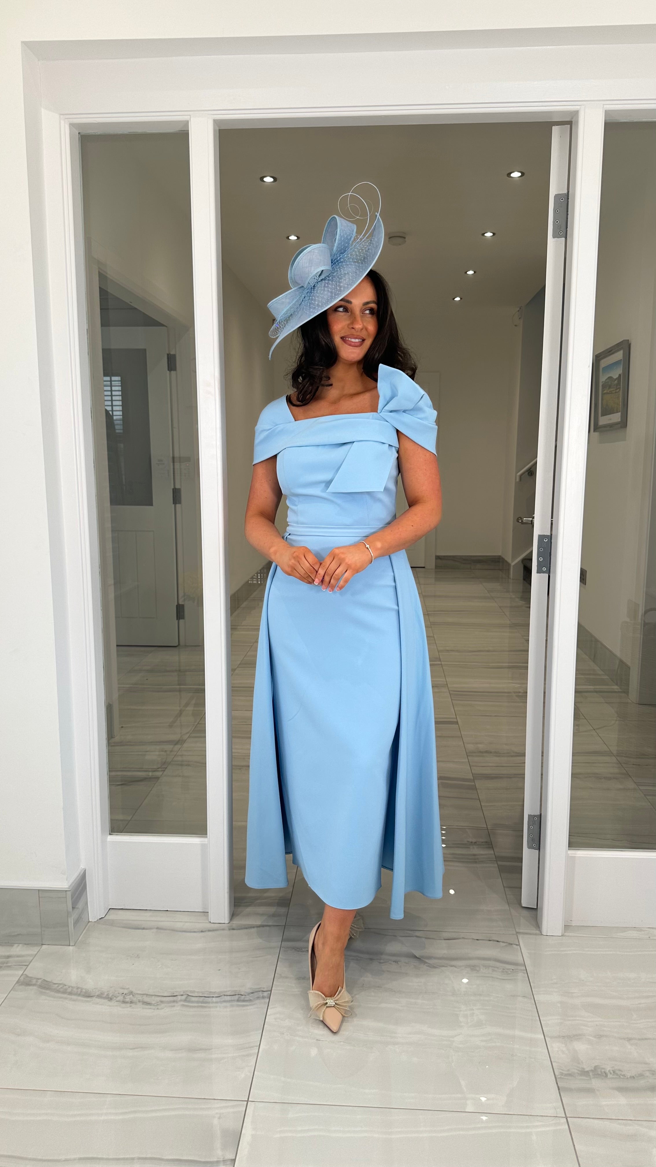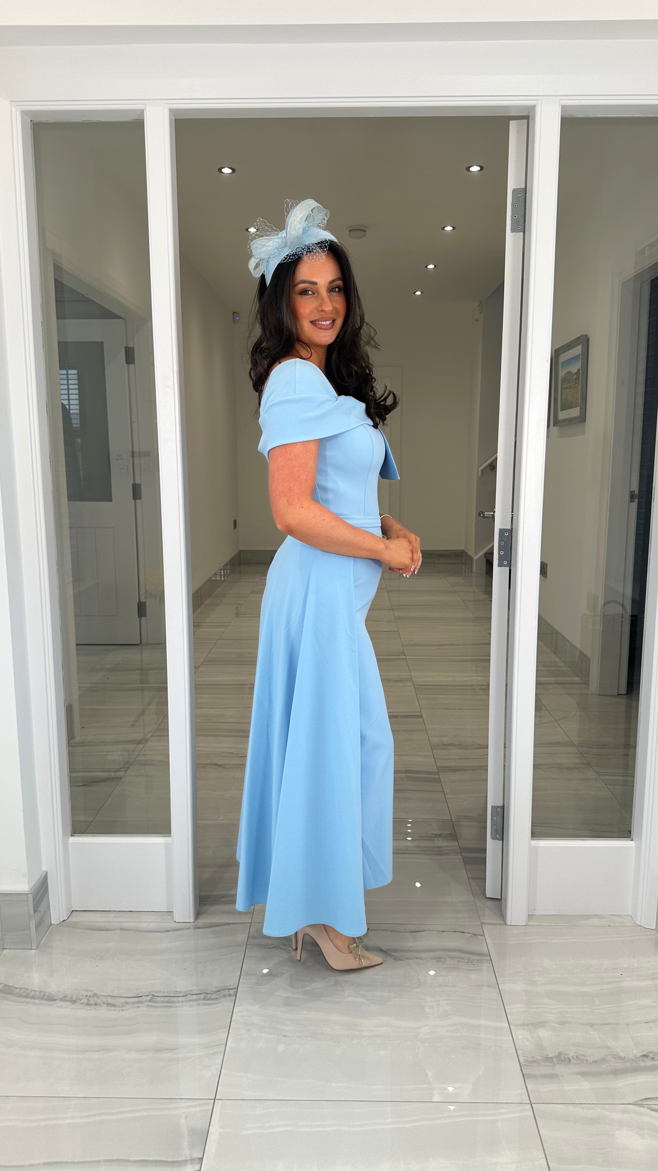 Beautiful blue coloured Bardot neckline dress featuring a bow detail, fitted skirt and extra skater skirt design