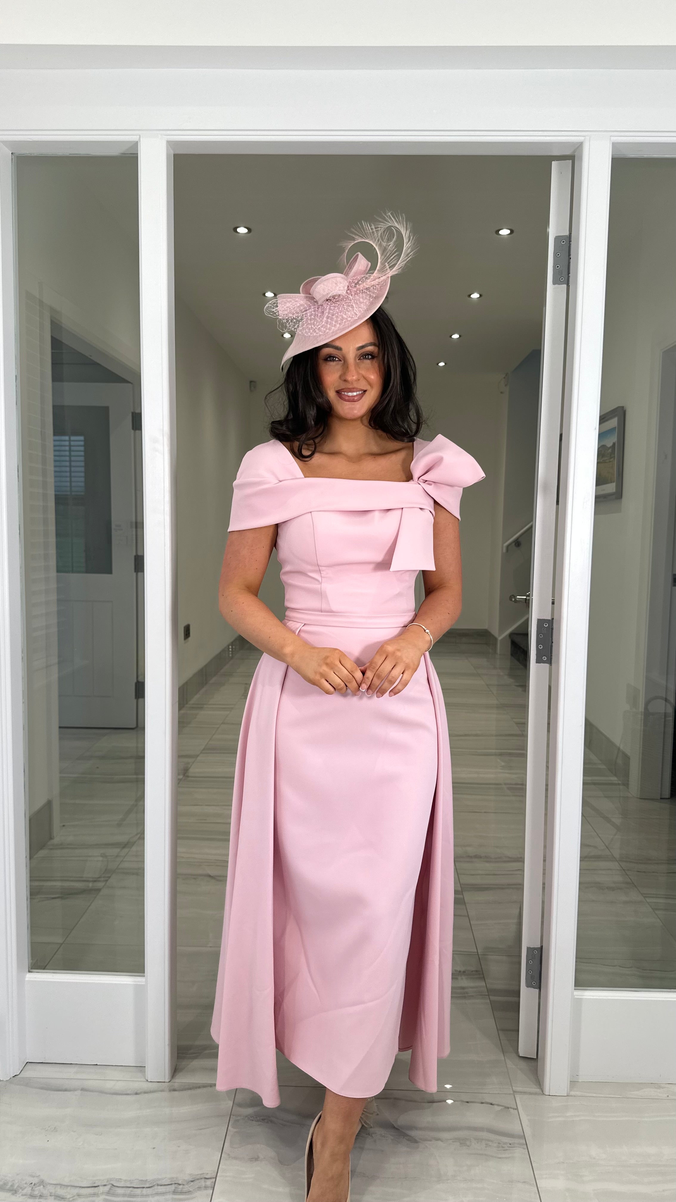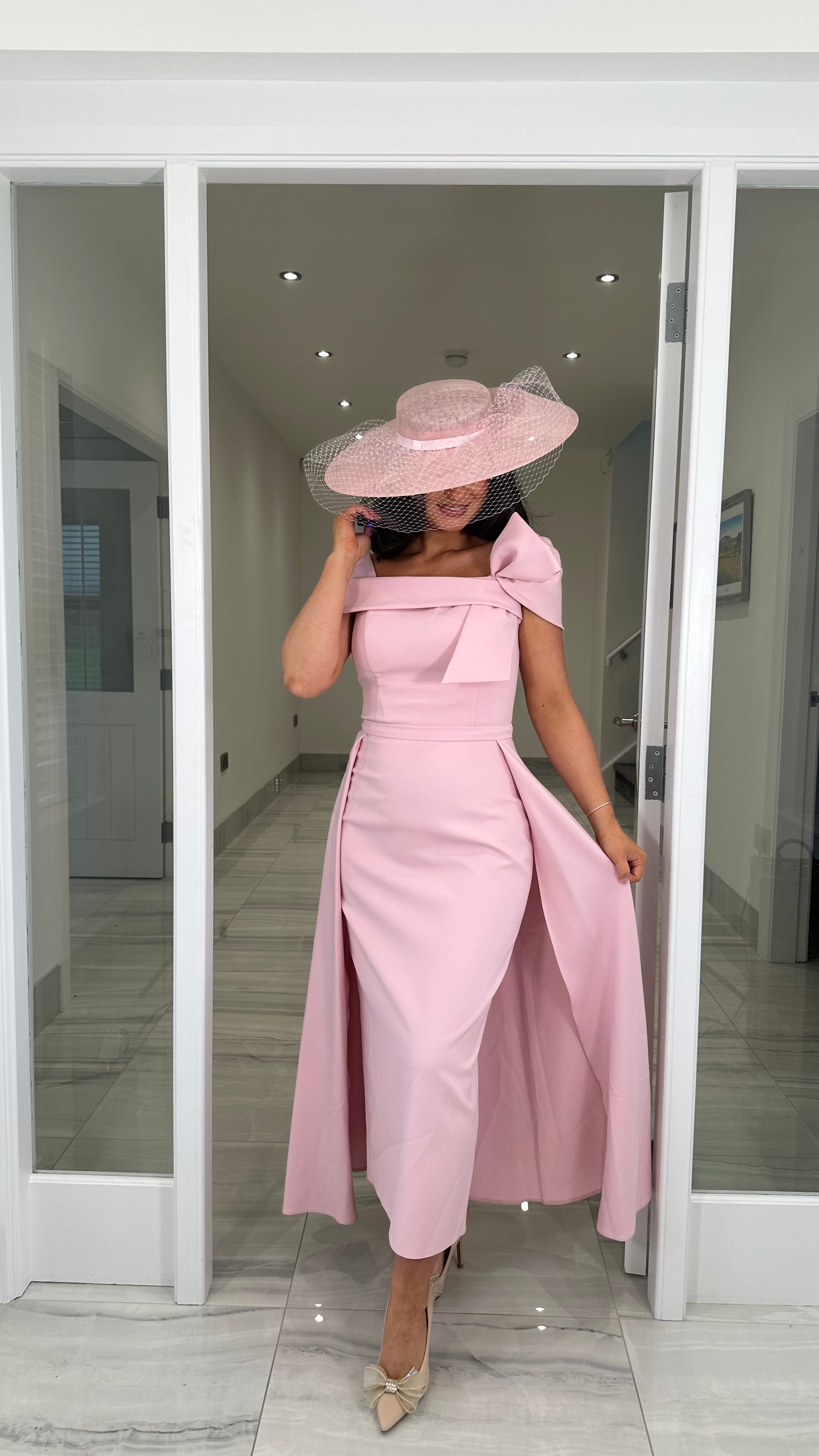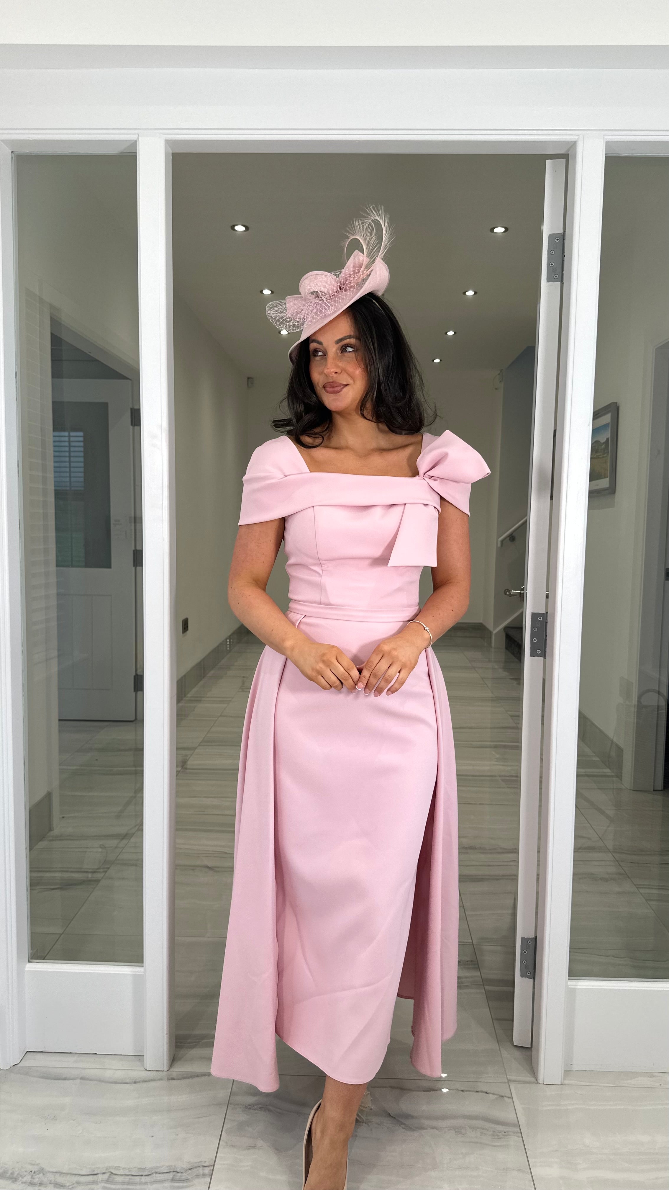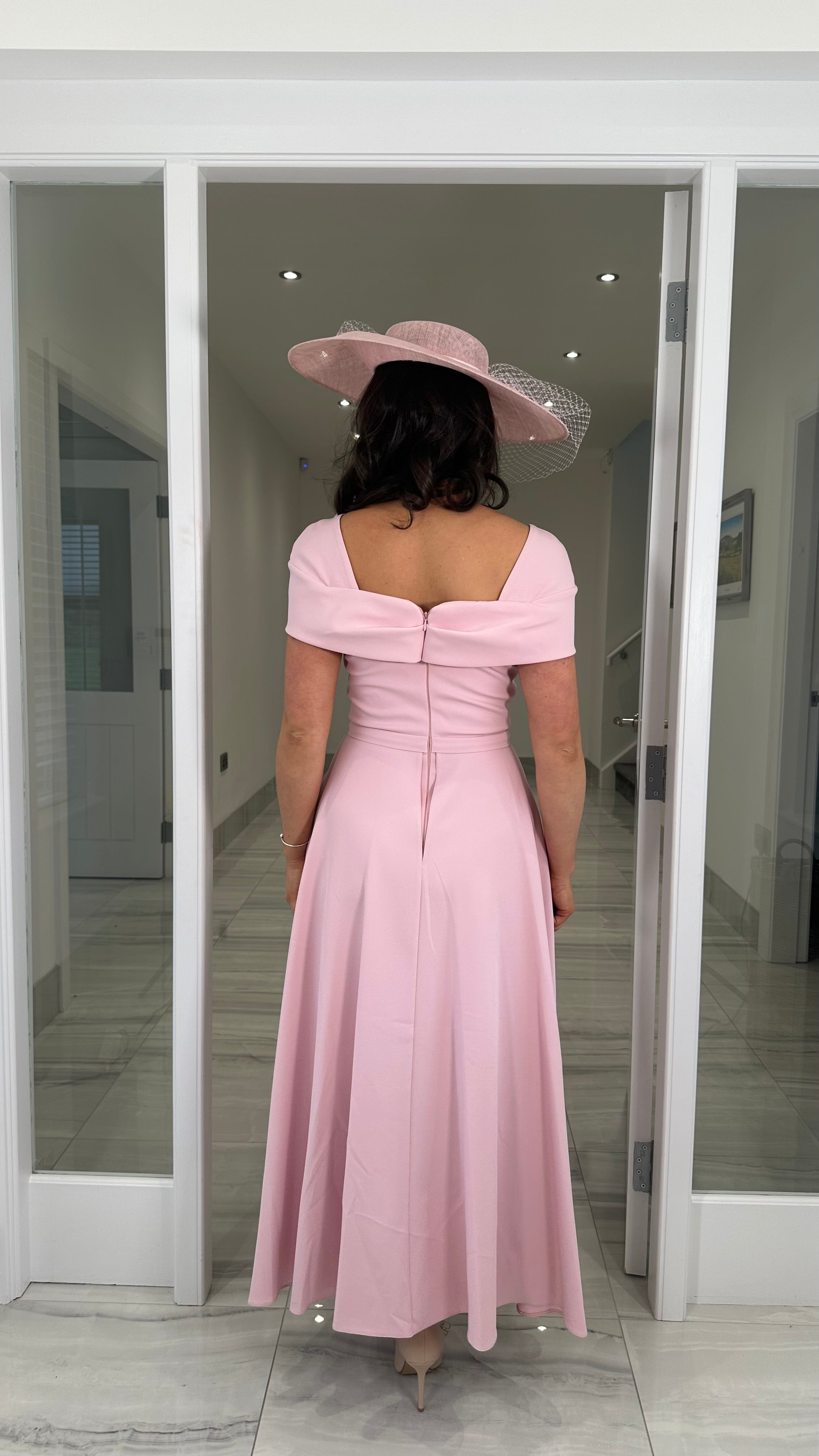 Beautiful pink coloured Bardot neckline dress featuring a bow detail, fitted skirt and extra skater skirt design