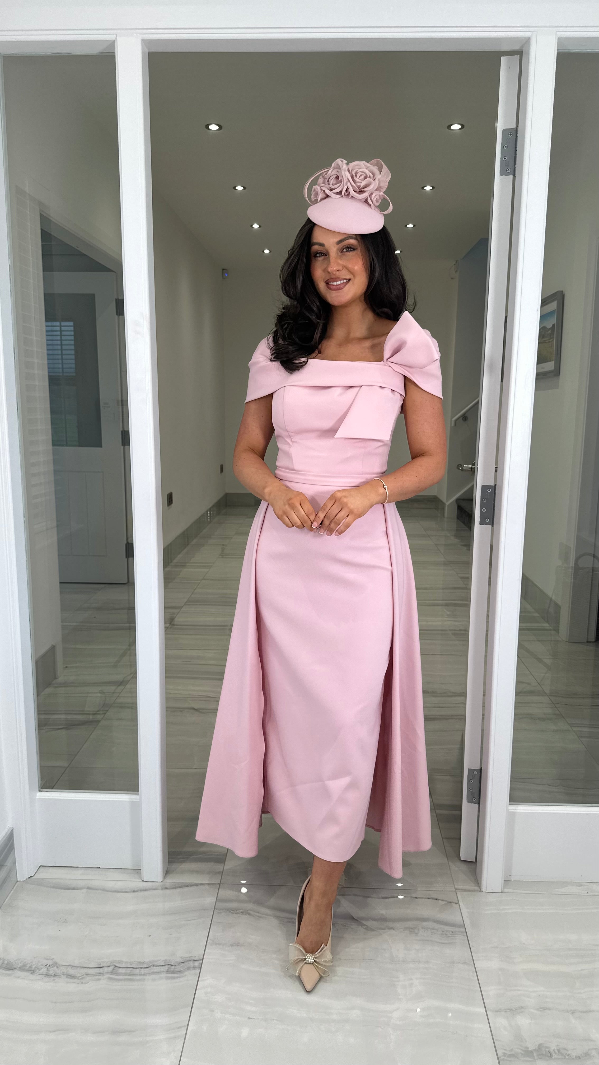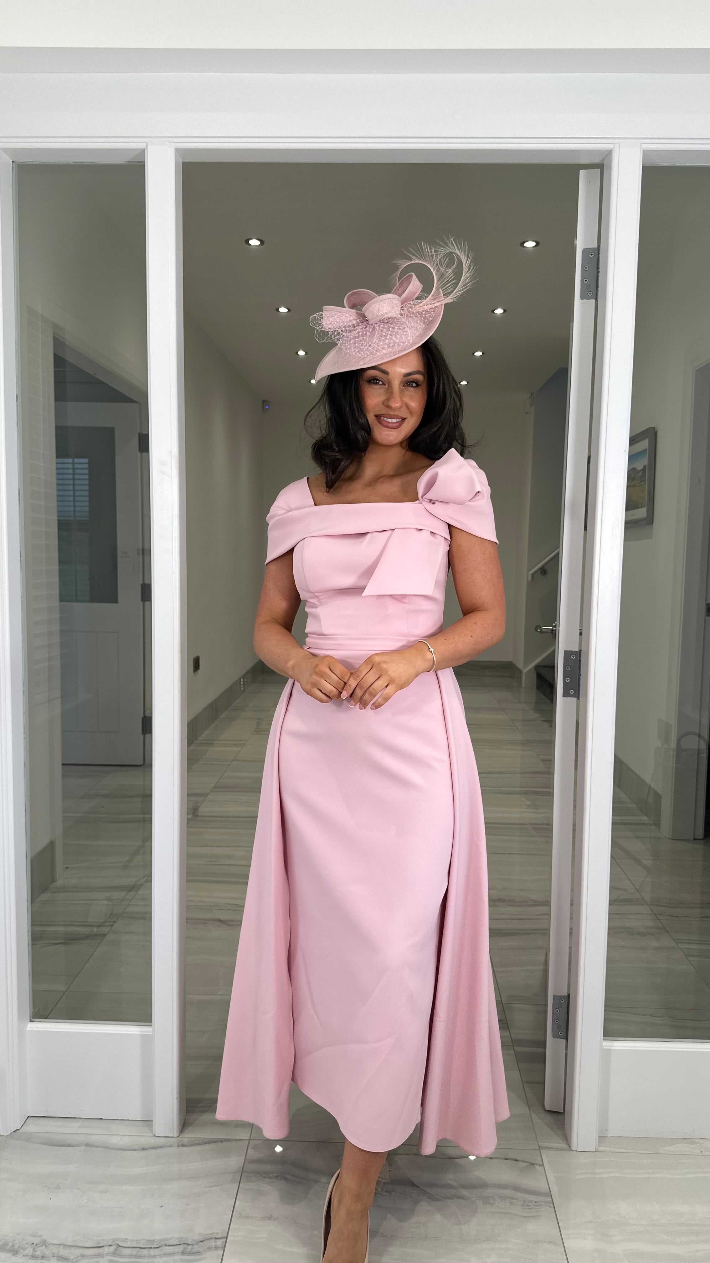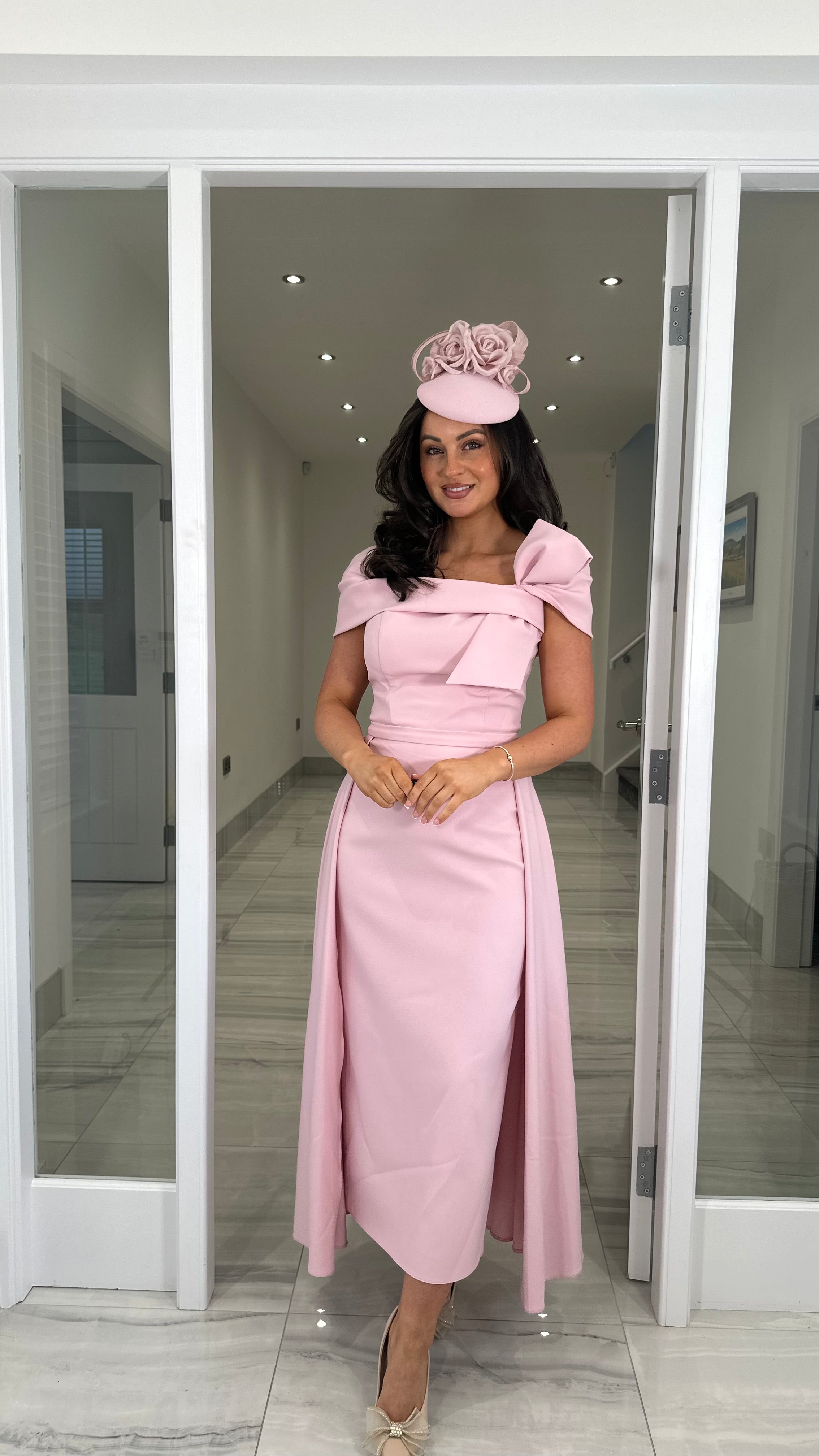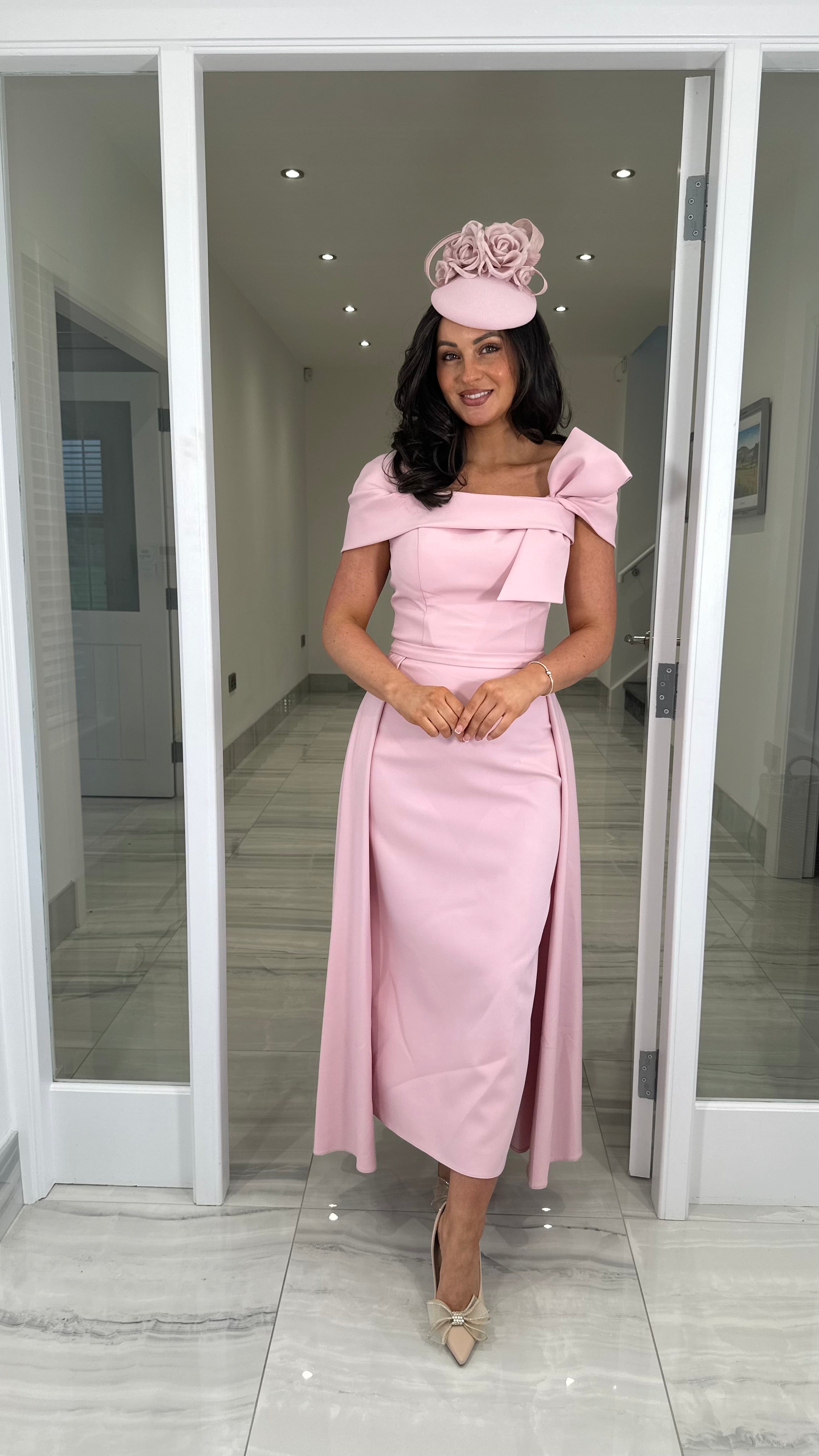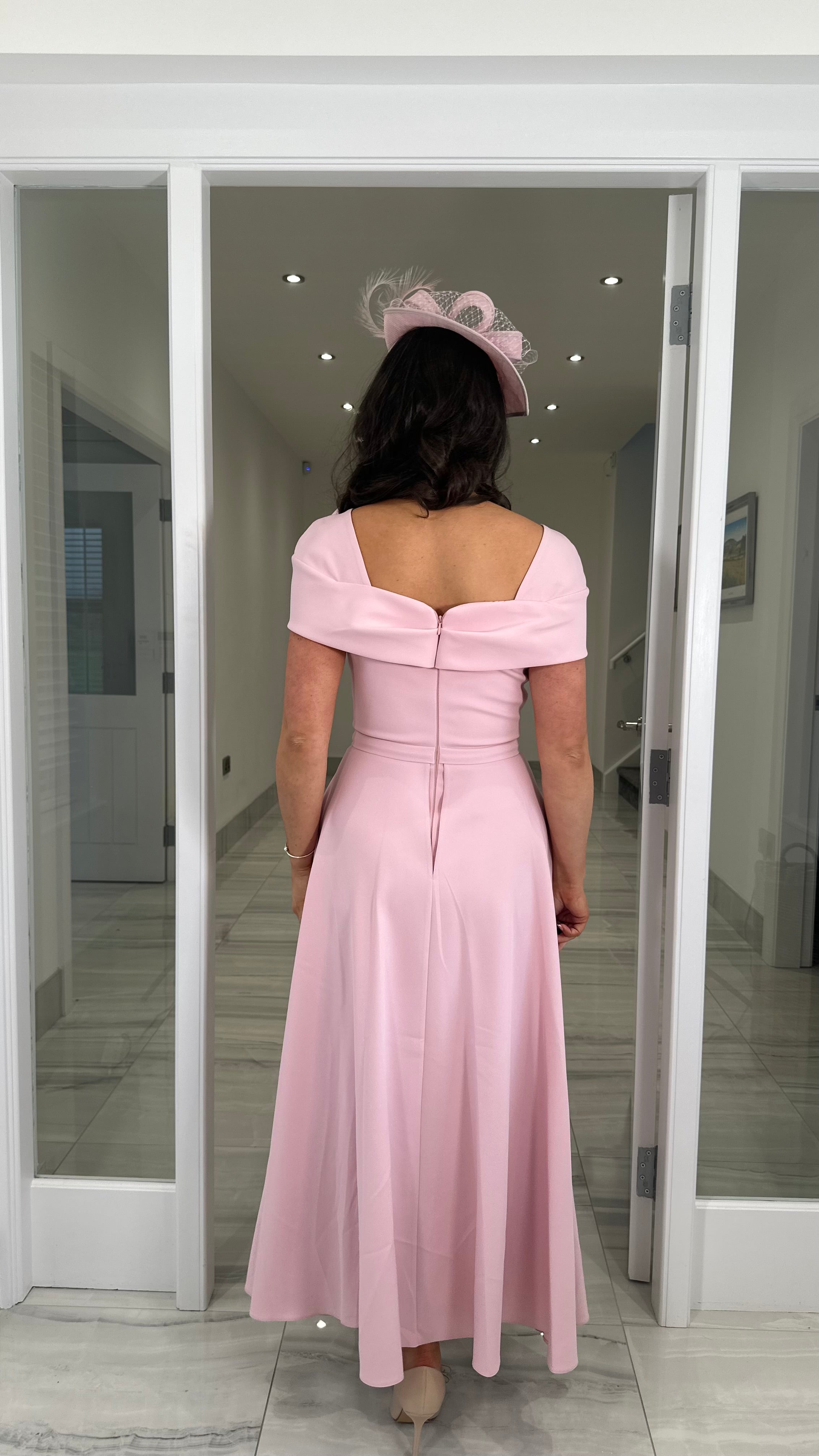 Beautiful pink coloured Bardot neckline dress featuring a bow detail, fitted skirt and extra skater skirt design