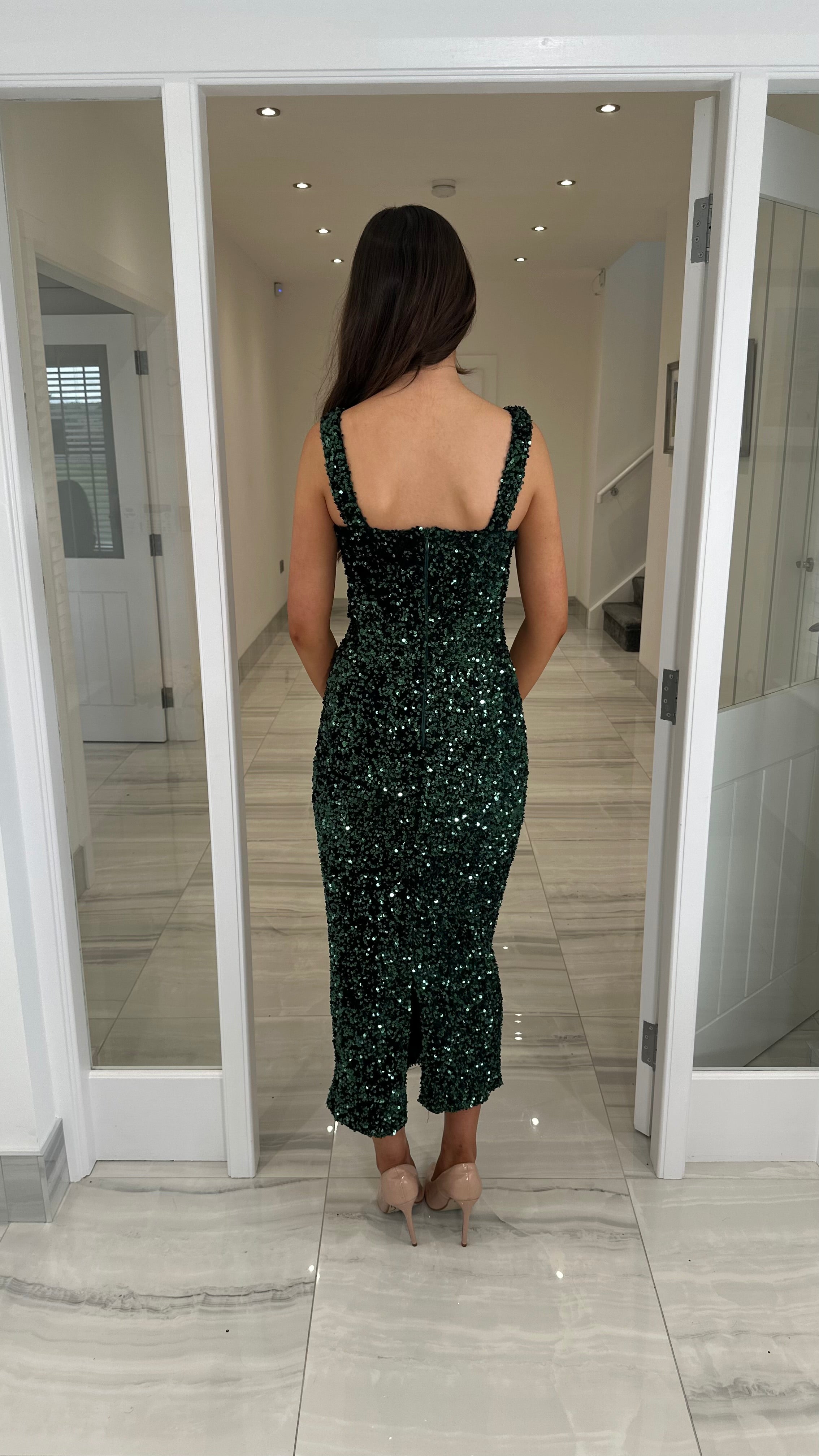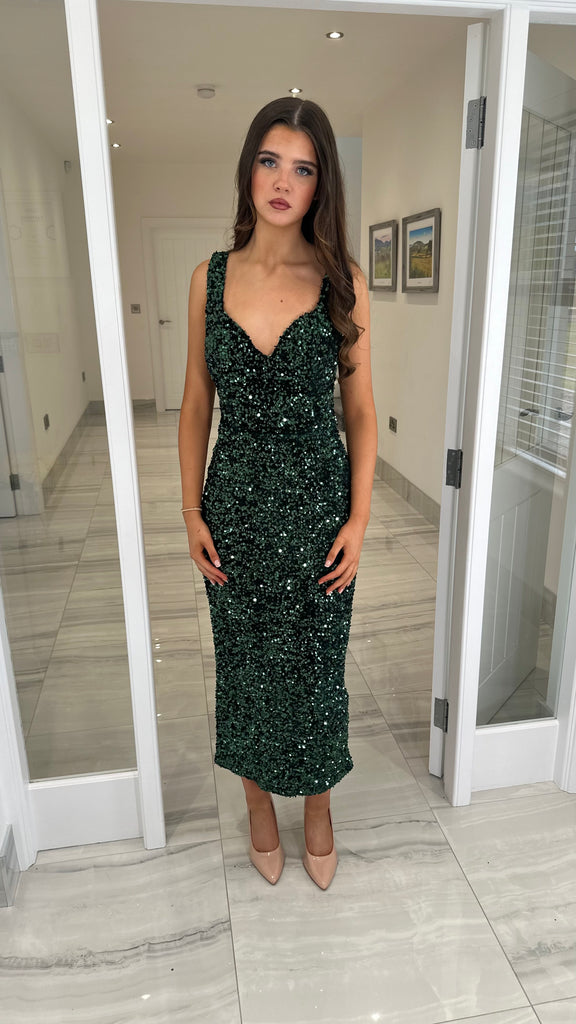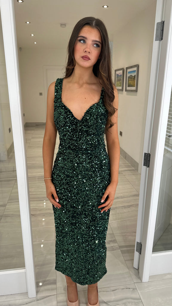 Green Sweetheart Neck Sequin Midi Dress