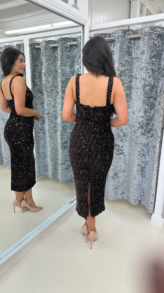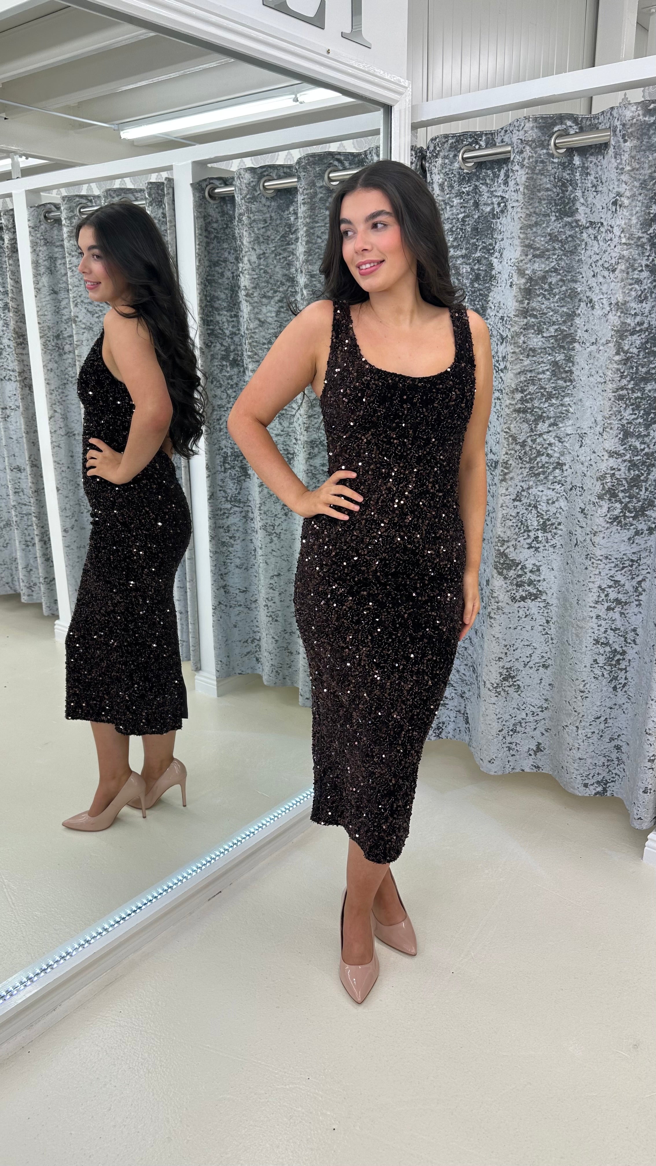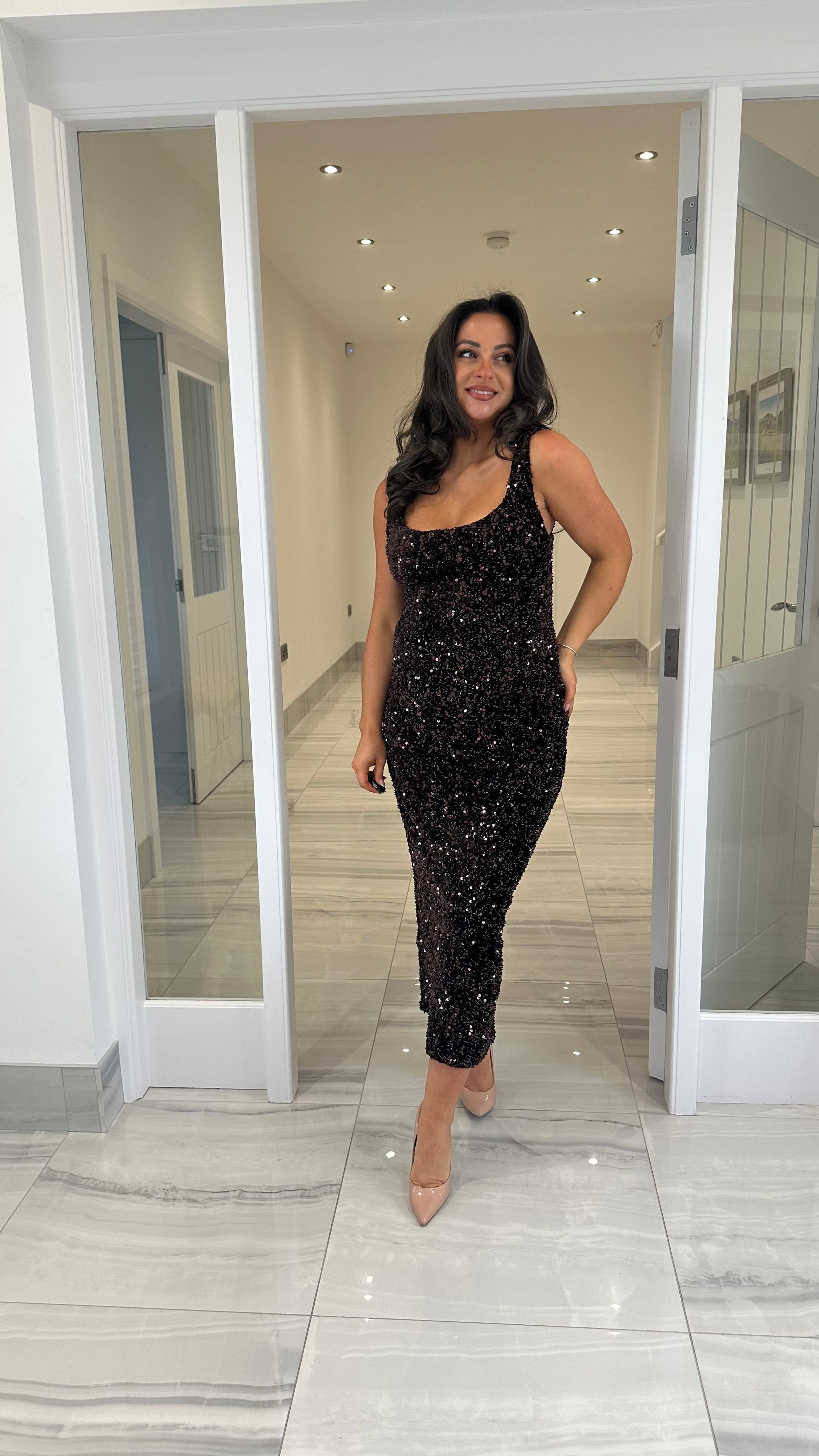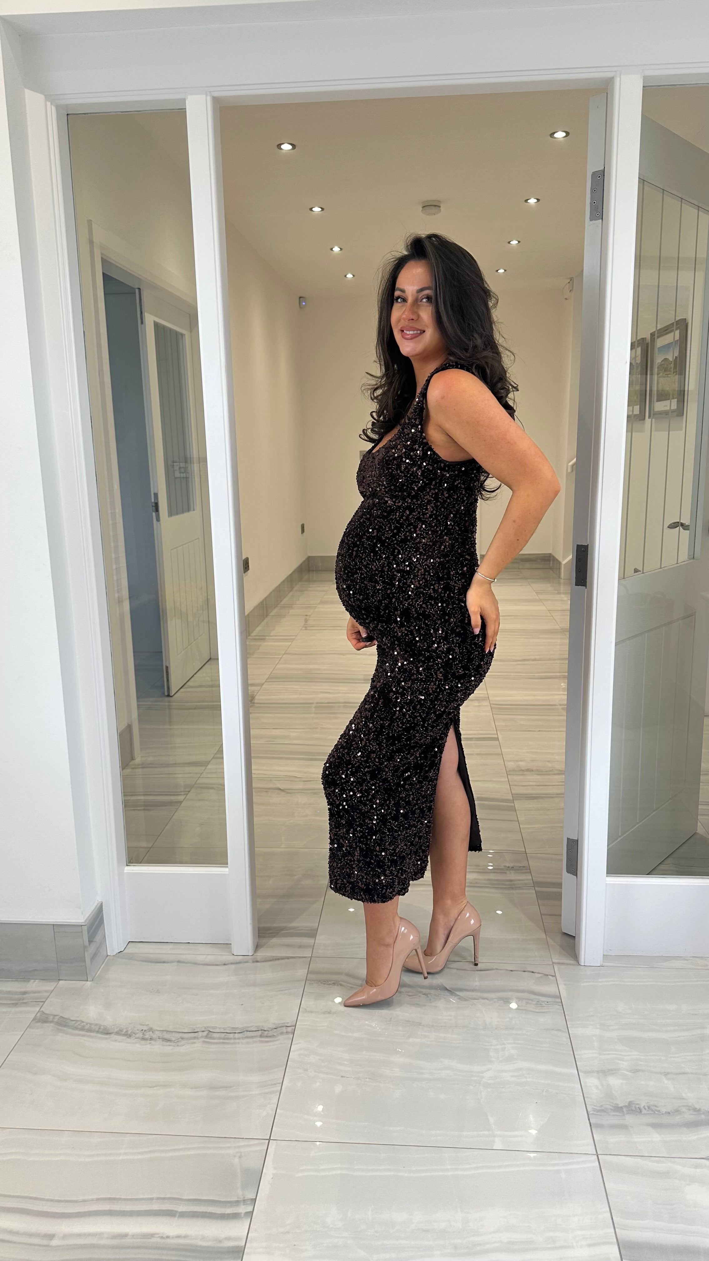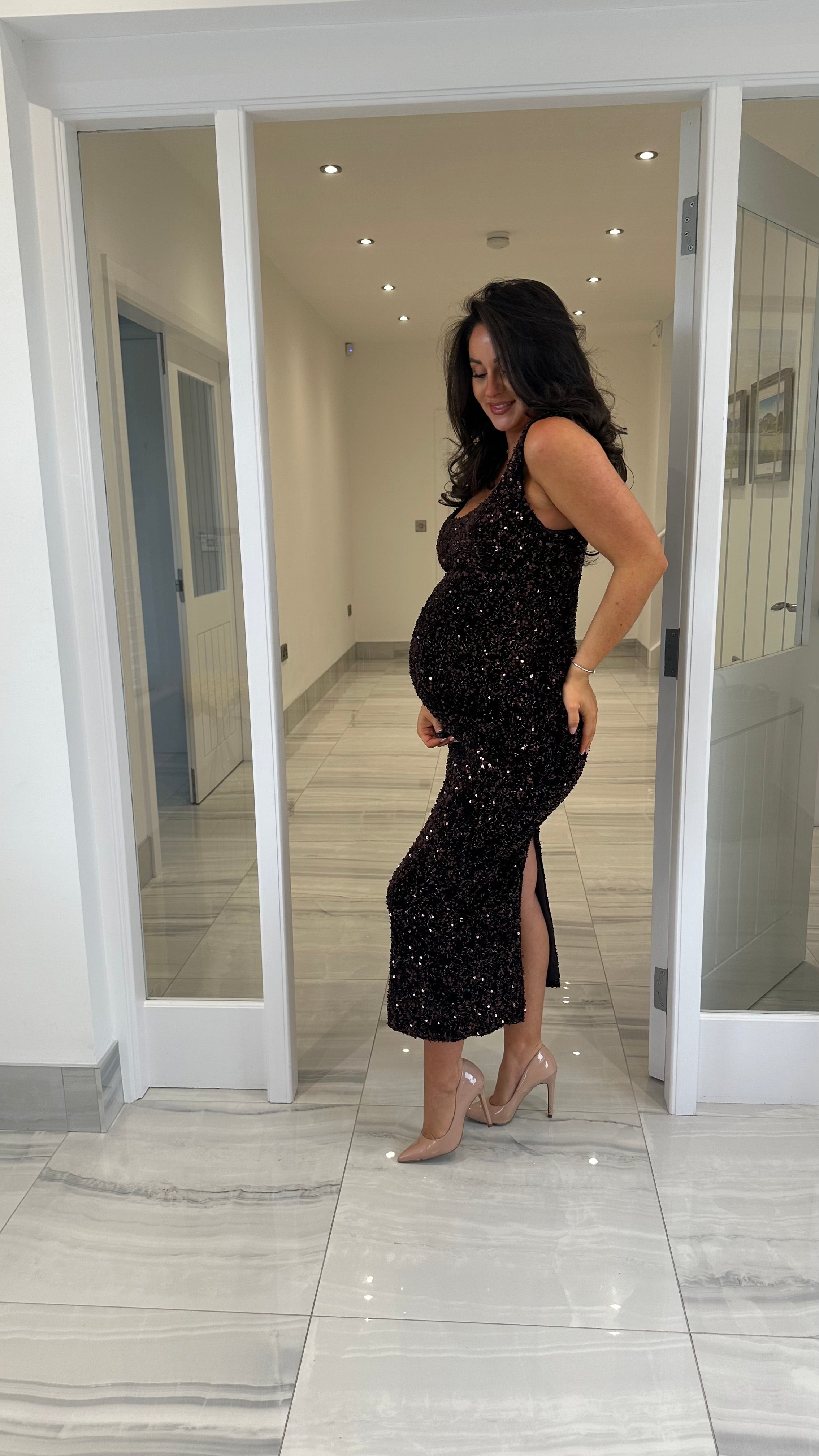 Beautiful all over sequin material on a velvet background. Comfortable and glamorous!