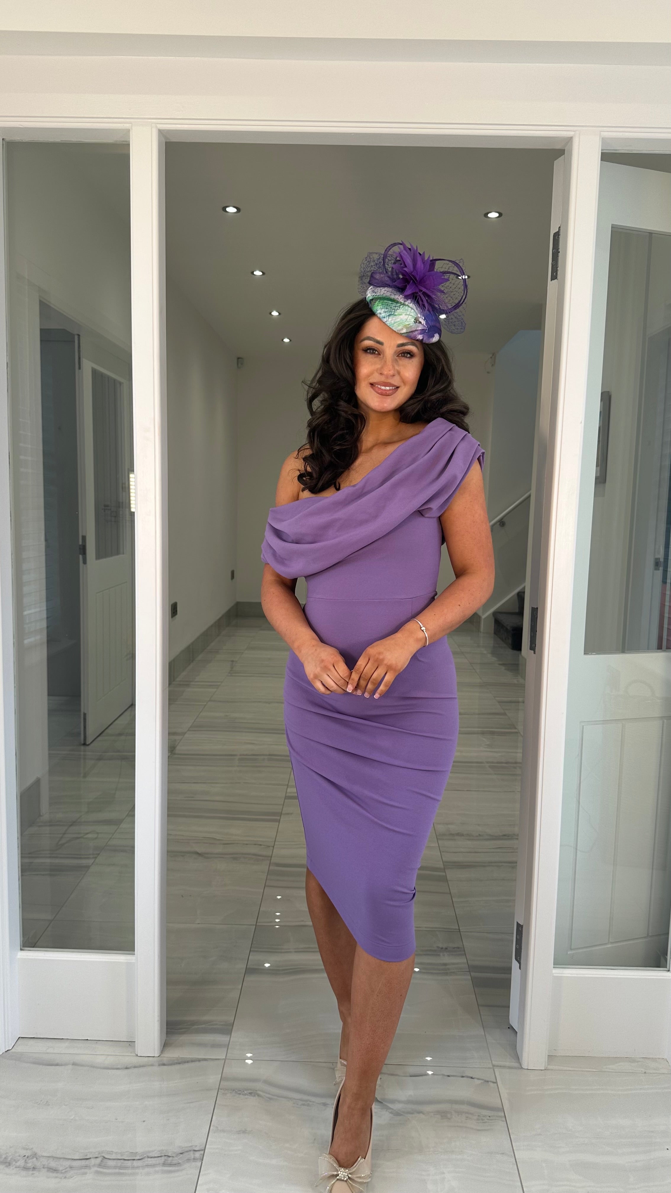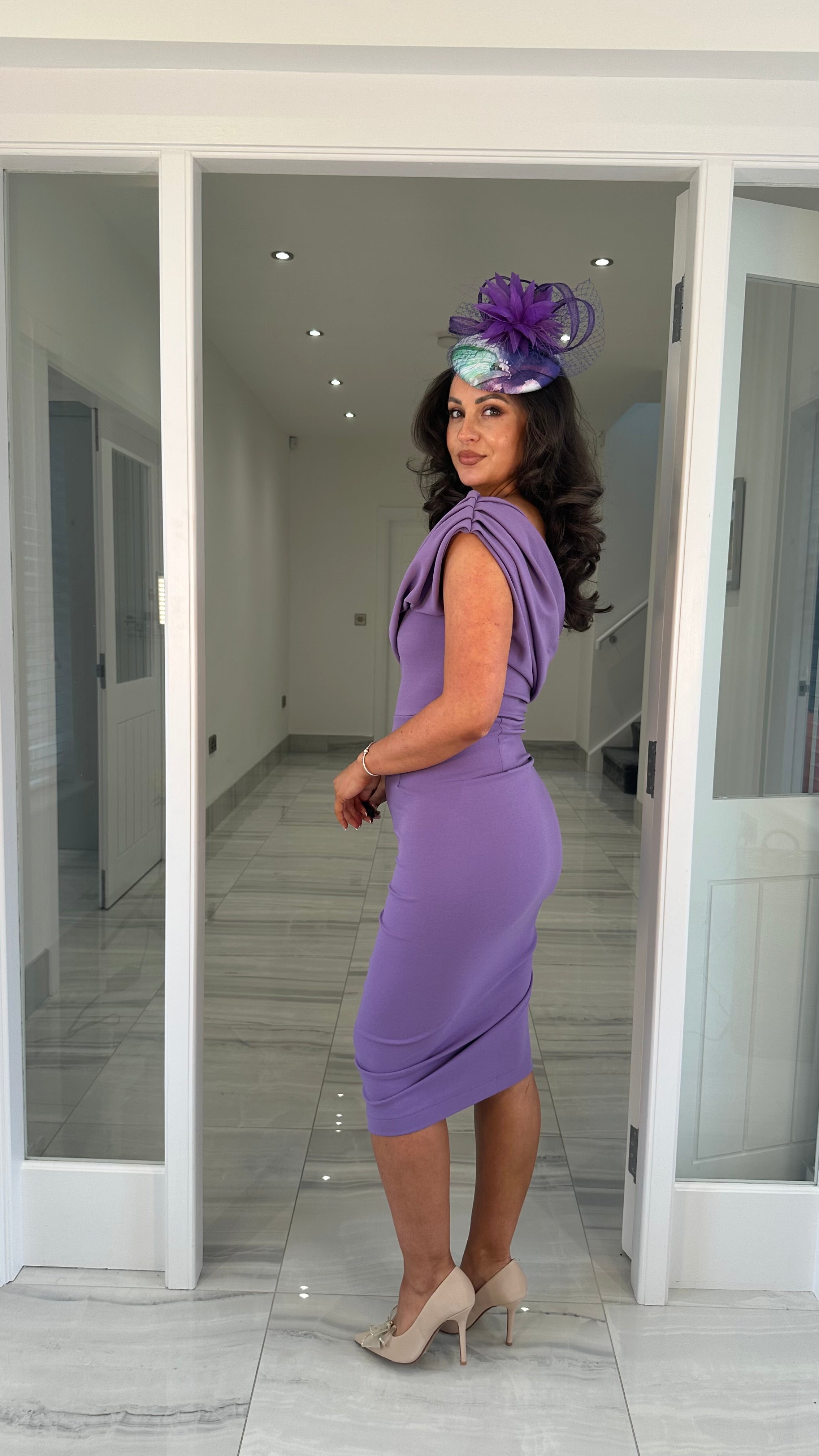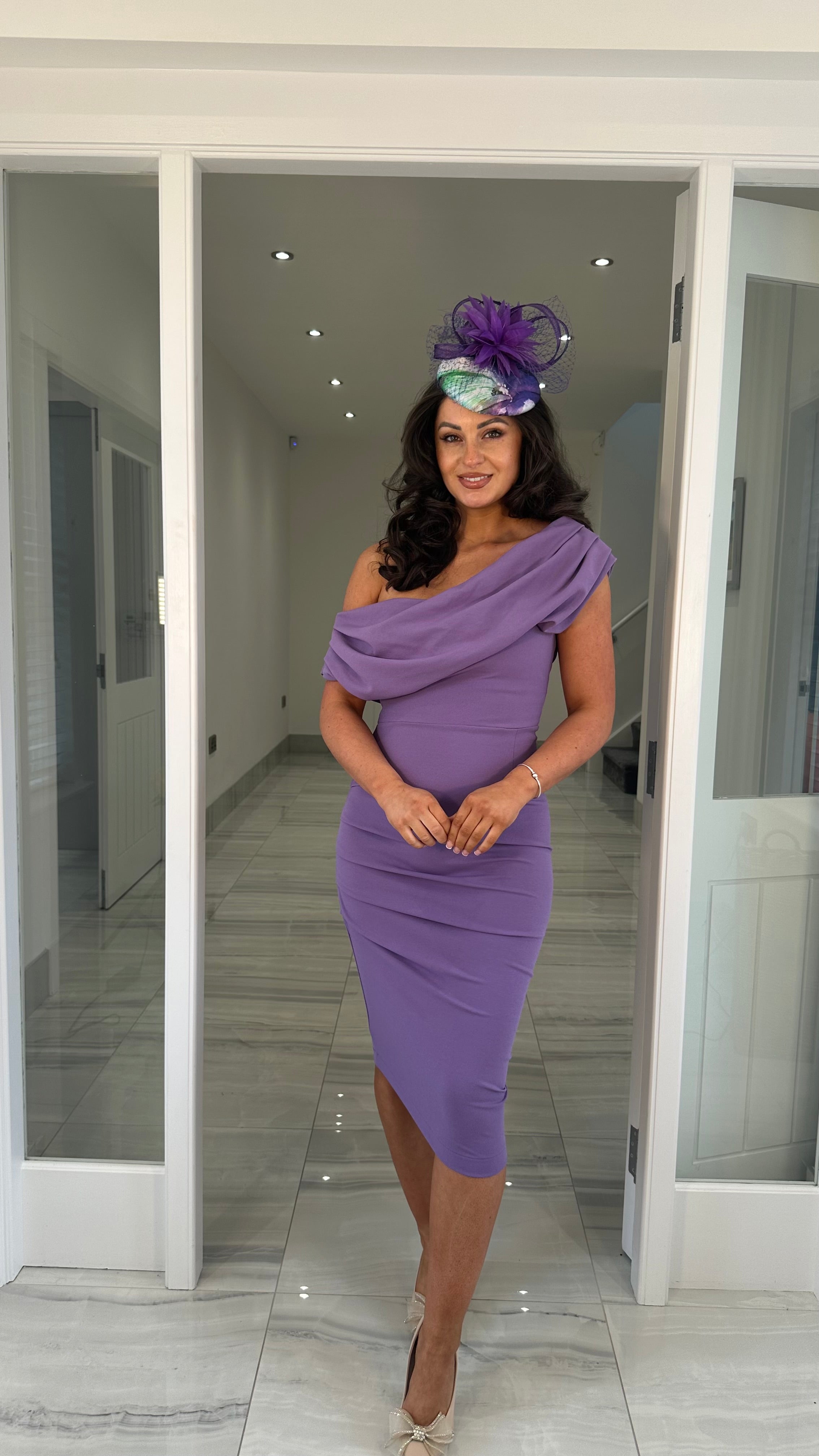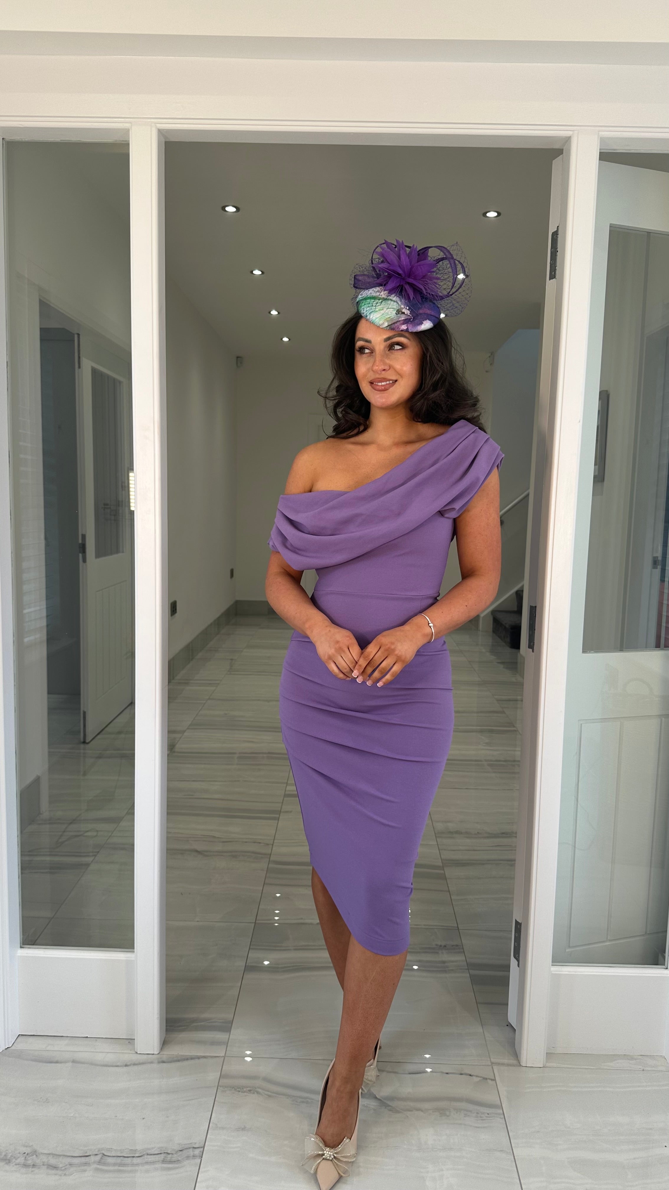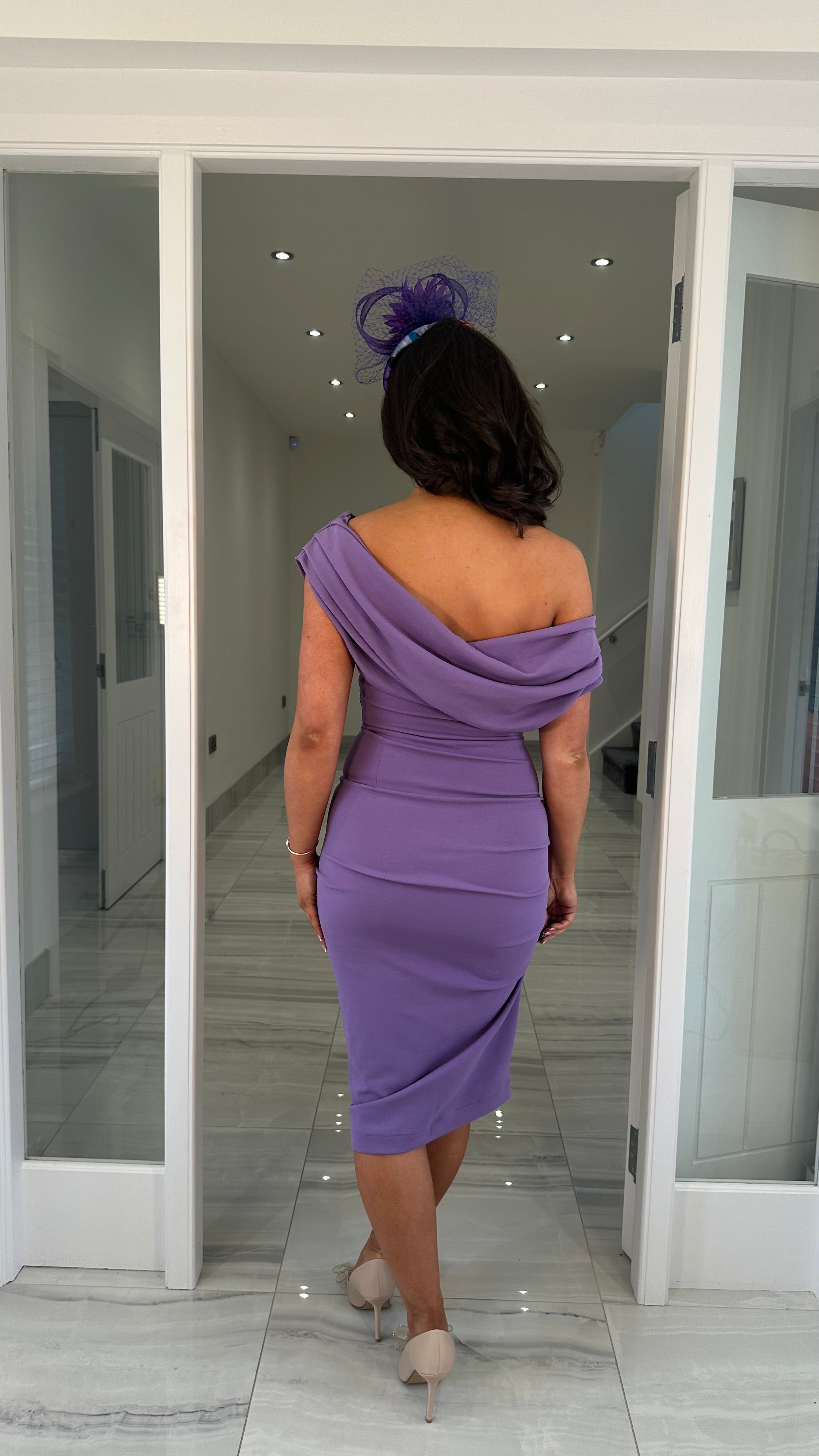 Lilac Drape Shoulder Ruched Midi Dress