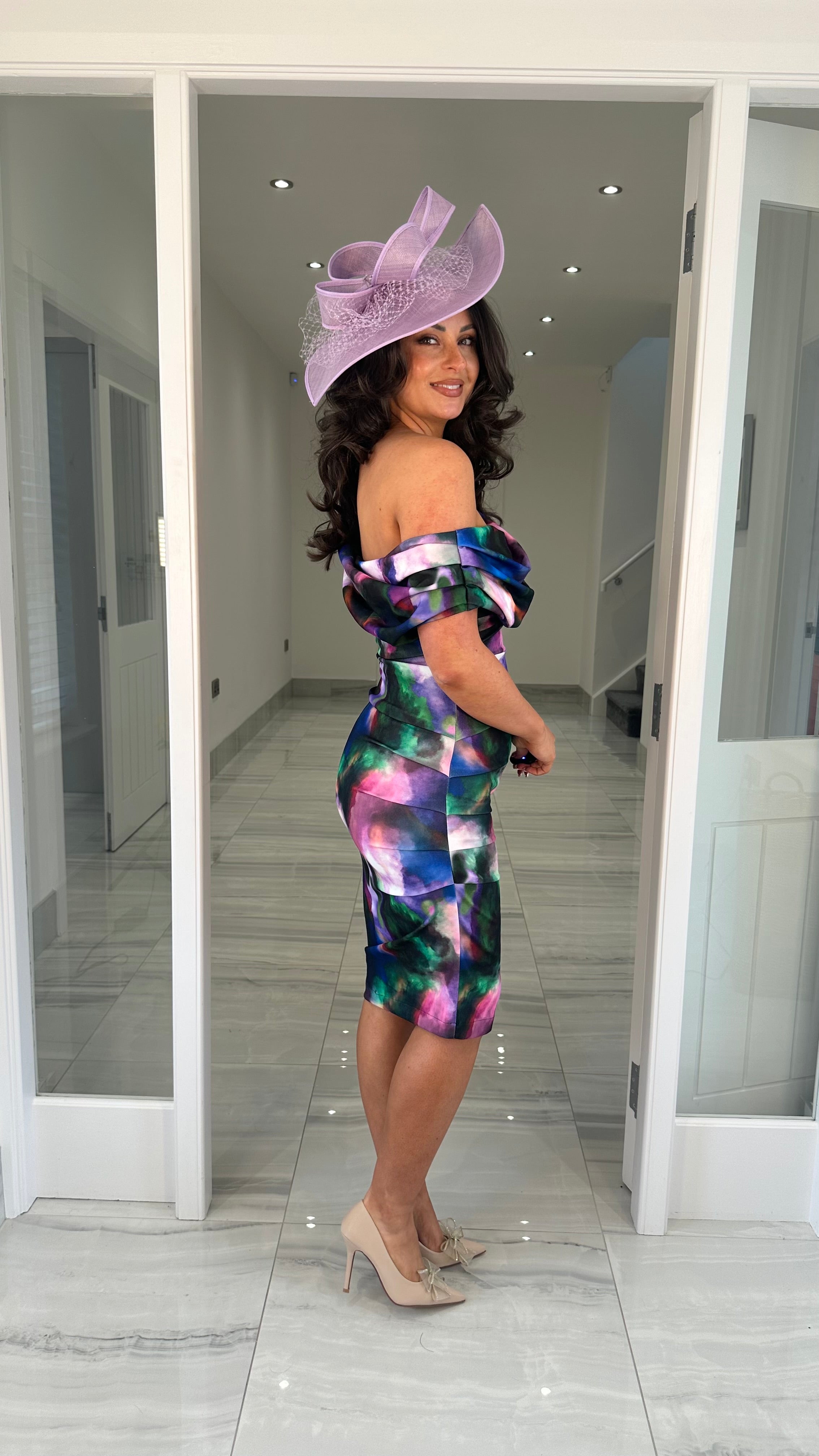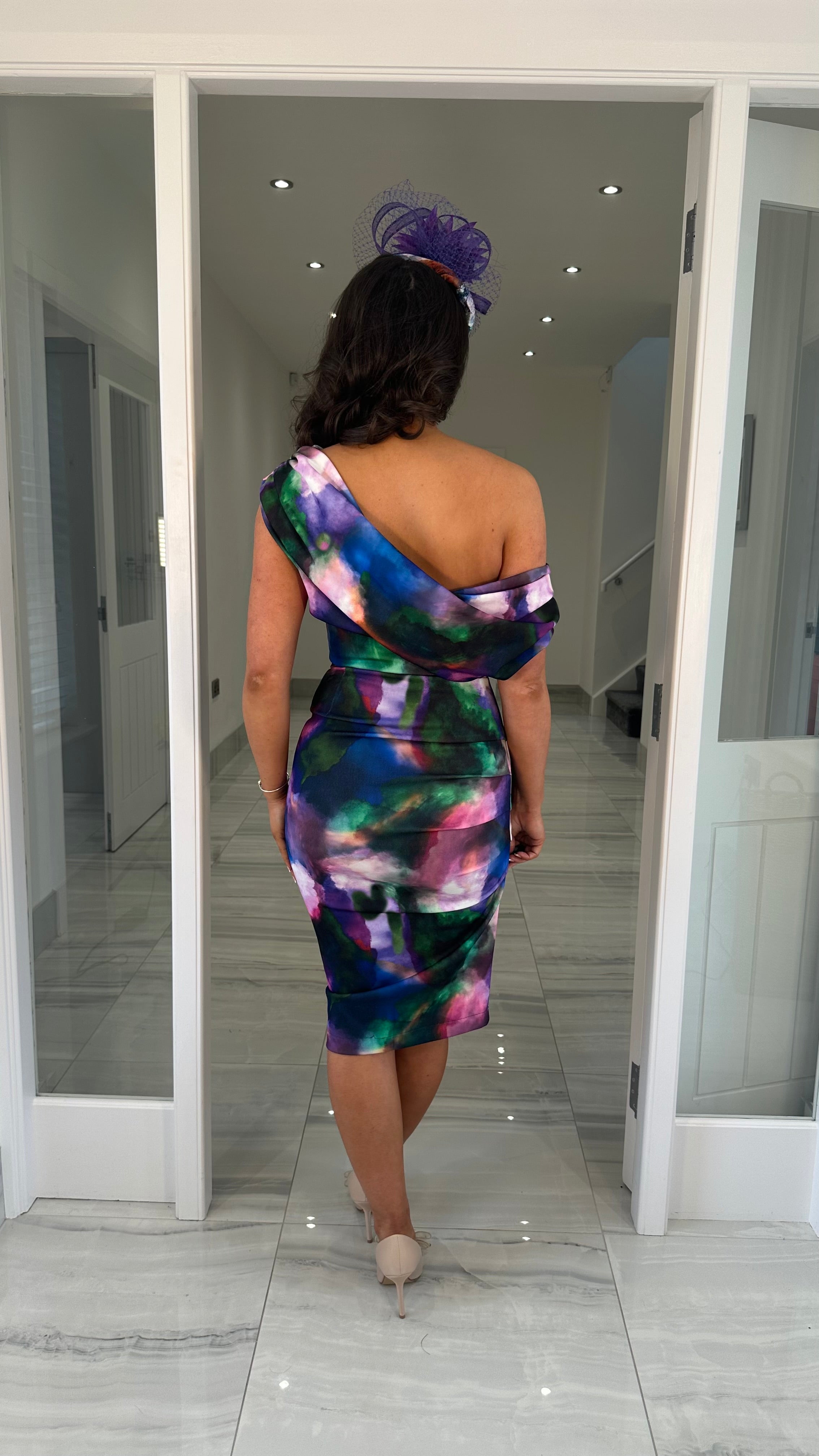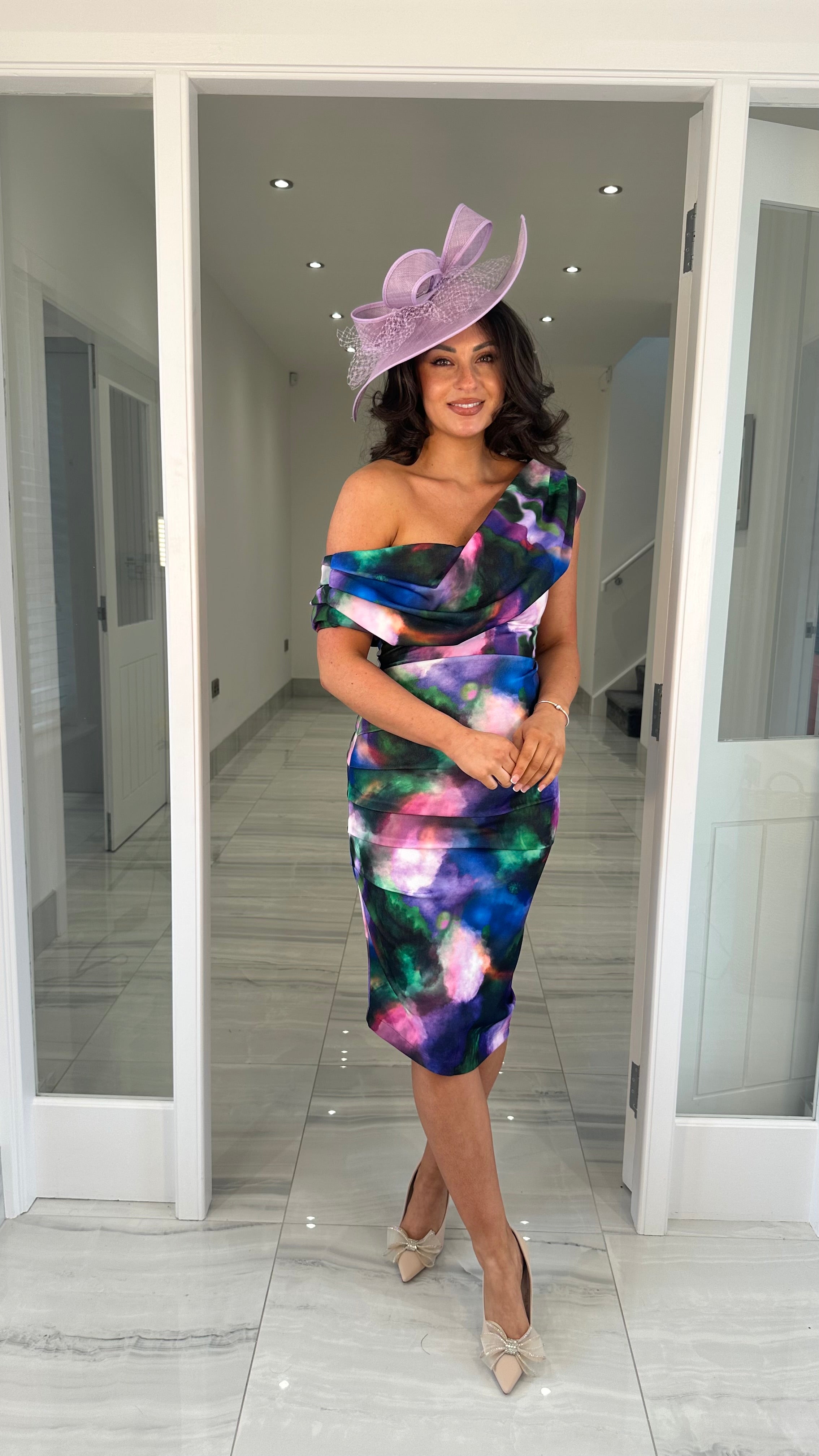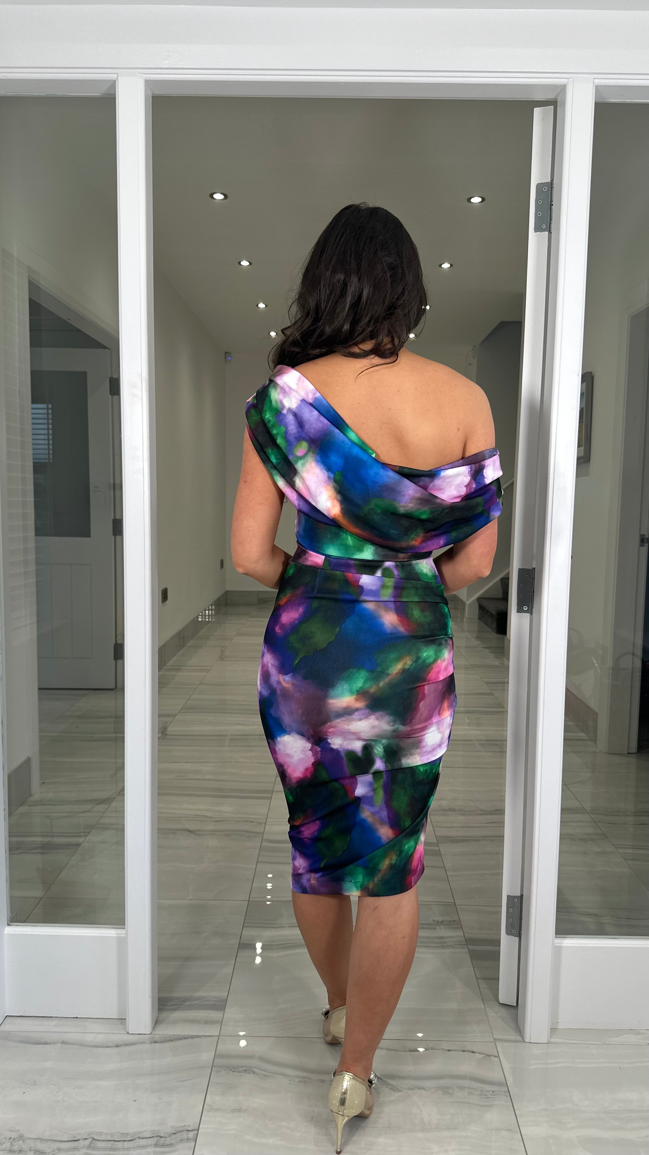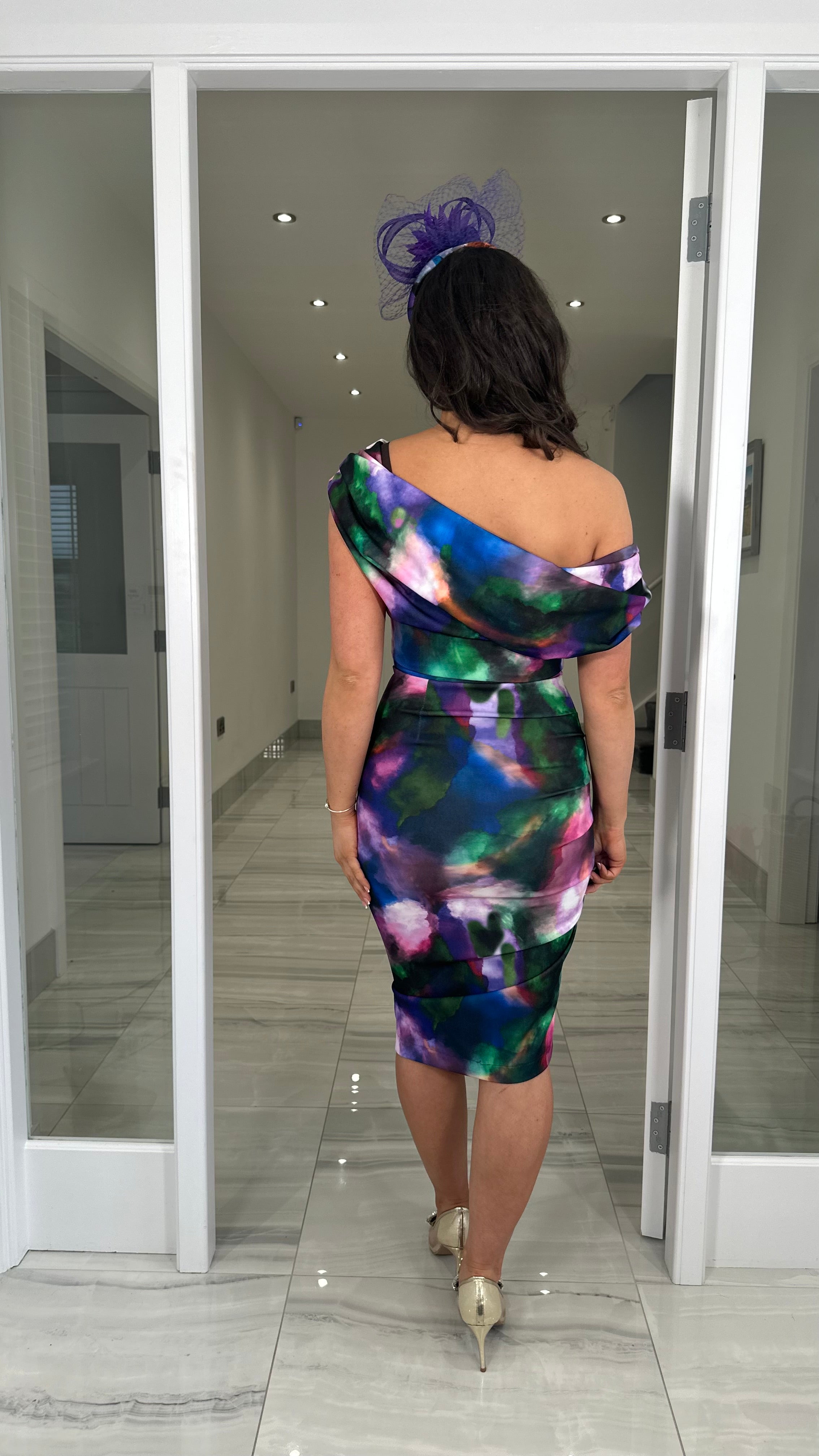 Purple Watercolour Print Drape Shoulder Ruched Midi Dress